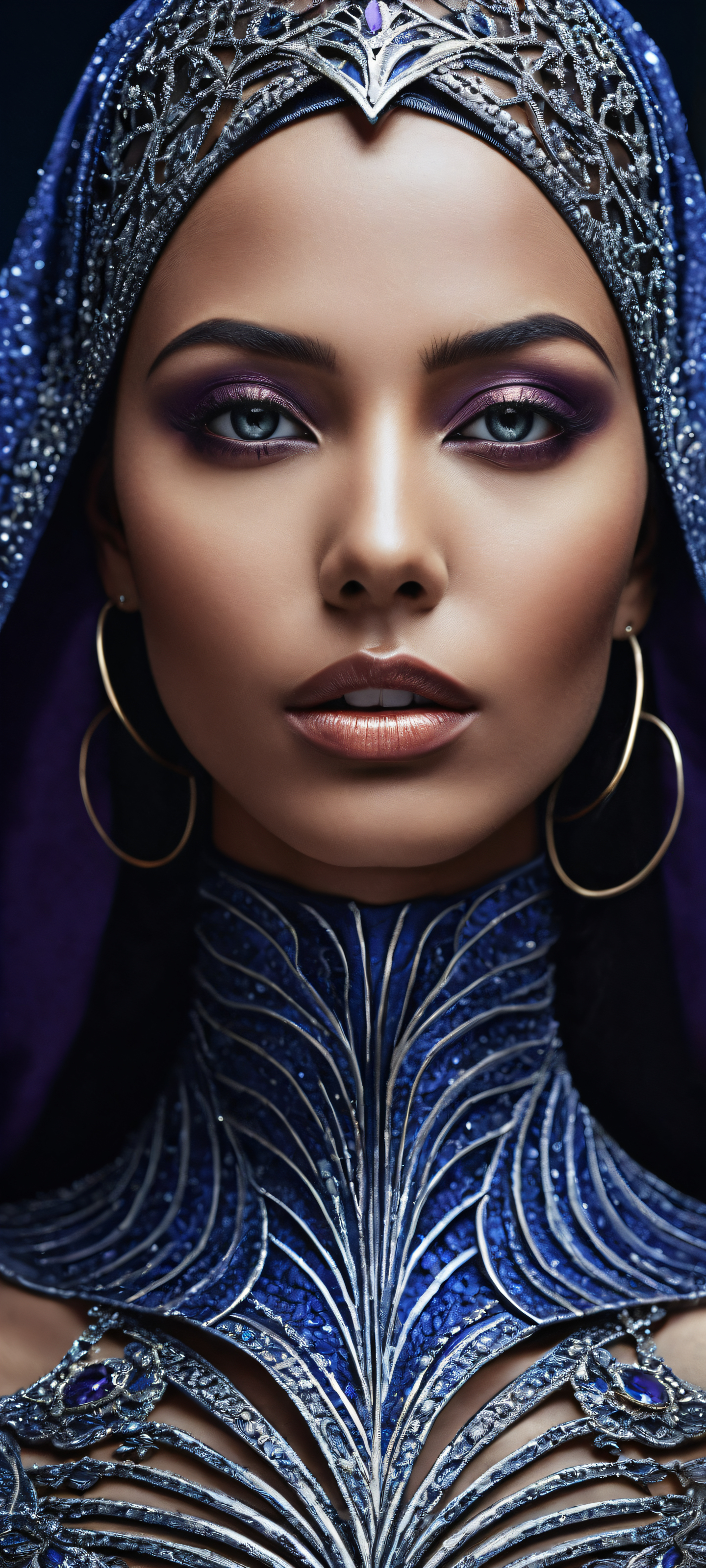 A breathtaking vertical portrait artwork of A stunning, intricately illustrated female portrait placed in the lower-middle with insane micro-details and extreme depth of field., Perfectly clean and empty top half with a vast pure void, while the detailed background unfolds in intricate glory below., Award-winning digital art, stunning visual impact, and pristine clarity., SLEEK DARK MODE AESTHETIC: Deep perfect blacks, striking crisp contrast, and elegant luminescent accents create an immersive atmosphere., The dominant color palette is characterized by deep blues and purples, punctuated with touches of warm golden light and subtle ambient occlusion effects., elegant low-key lighting, deep perfect blacks, striking contrast, sleek dark mode aesthetic, luminescent accents, deep rich colors, portrait composition, centered subject in the lower middle, perfectly clean and smooth top half for UI, extreme depth of field blurred background, highly textured surfaces, intricate micro-details, physically based rendering, award-winning digital art, epic breathtaking scale, stunning visual impact, perfect composition, macOS wallpaper aesthetic, masterpiece, 2K QHD resolution, 9:20 aspect ratio.