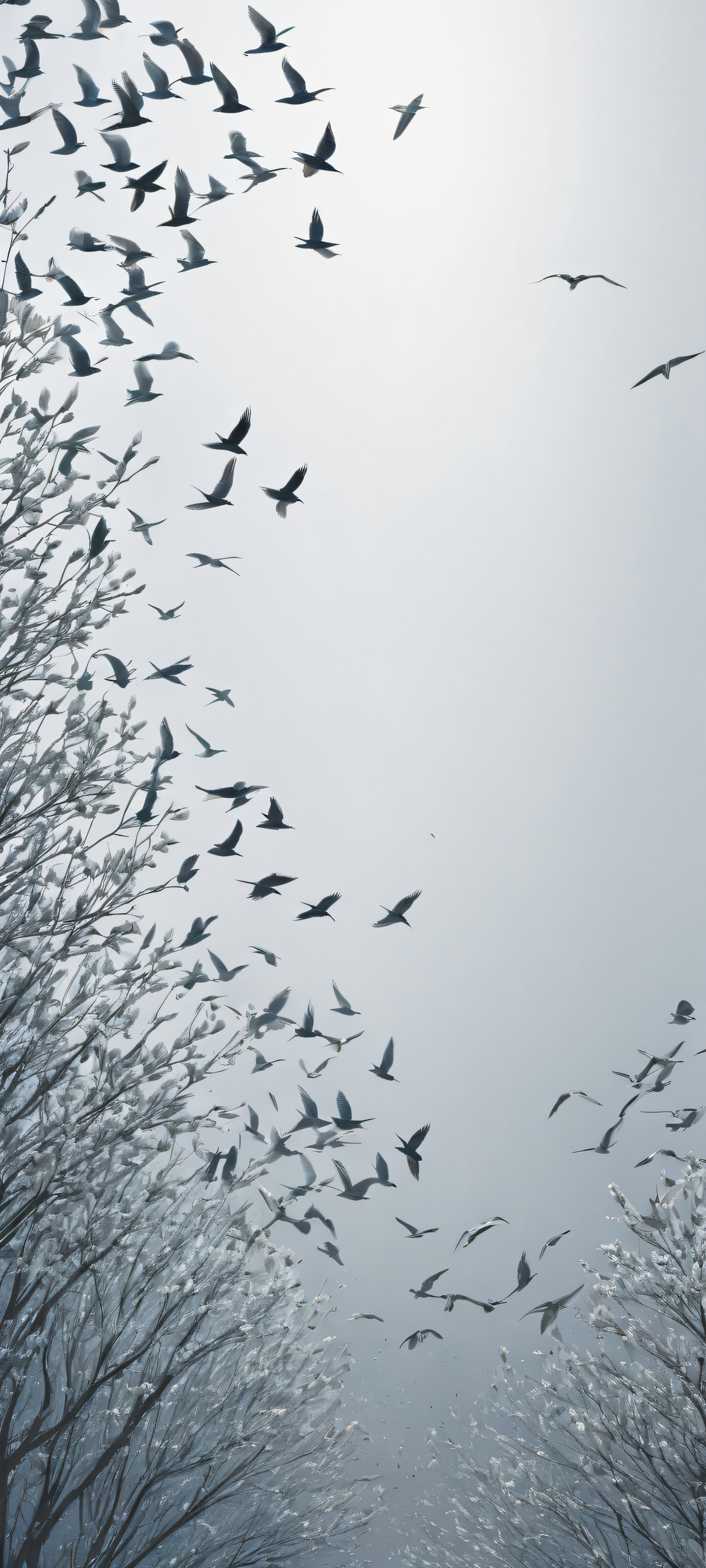Marvel at the breathtaking vertical portrait artwork featuring a stunning flock of birds, meticulously crafted with intricate micro-details on their wings and feathers. Perfectly clean and empty top half allows the silhouetted birds to take center stage in a 16:9 aspect ratio. This award-winning digital art is perfectly optimized for your iPhone, Samsung Galaxy, or Android home screen.