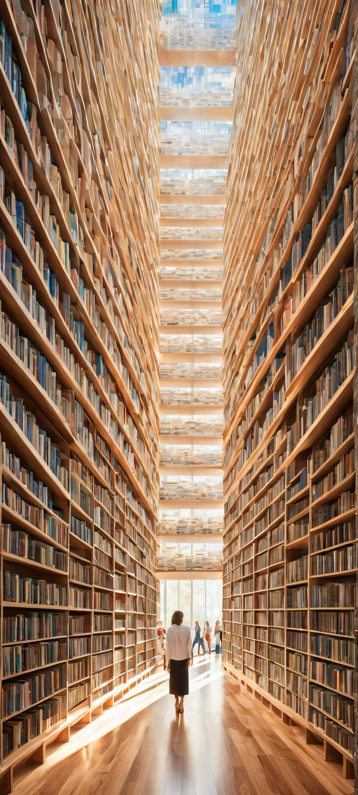 A breathtaking vertical portrait artwork of A perfectly arranged digital library placed in the lower-middle with insane micro-details, such as precision-crafted book spines and faintly glowing screen highlights., Perfectly clean and empty top half with vast pure void, serving as a minimalist backdrop for the main subject. The bottom half features a swirling vortex of colorful data streams, hinting at the chaos and endless possibilities within., Award-winning digital art, pristine clarity, with a focus on subtle texture and depth., Ethereal lighting illuminates the scene, casting a radiant glow on the digital library’s spines and screens, with subtle ray-traced reflections adding depth and dimensionality to the overall design., Dominant color palette features a soothing blend of calming blues (#4567b7) and creamy whites (#f5f5dc), evoking feelings of serenity and tranquility while subtly hinting at the endless possibilities hidden within., ethereal lighting, radiant, brilliant colors, ray traced reflections, pristine clarity, portrait composition, centered subject in the lower middle, perfectly clean and smooth top half for UI, extreme depth of field blurred background, highly textured surfaces, intricate micro-details, physically based rendering, award-winning digital art, epic breathtaking scale, stunning visual impact, perfect composition, macOS wallpaper aesthetic, masterpiece, 2K QHD resolution, 9:20 aspect ratio.