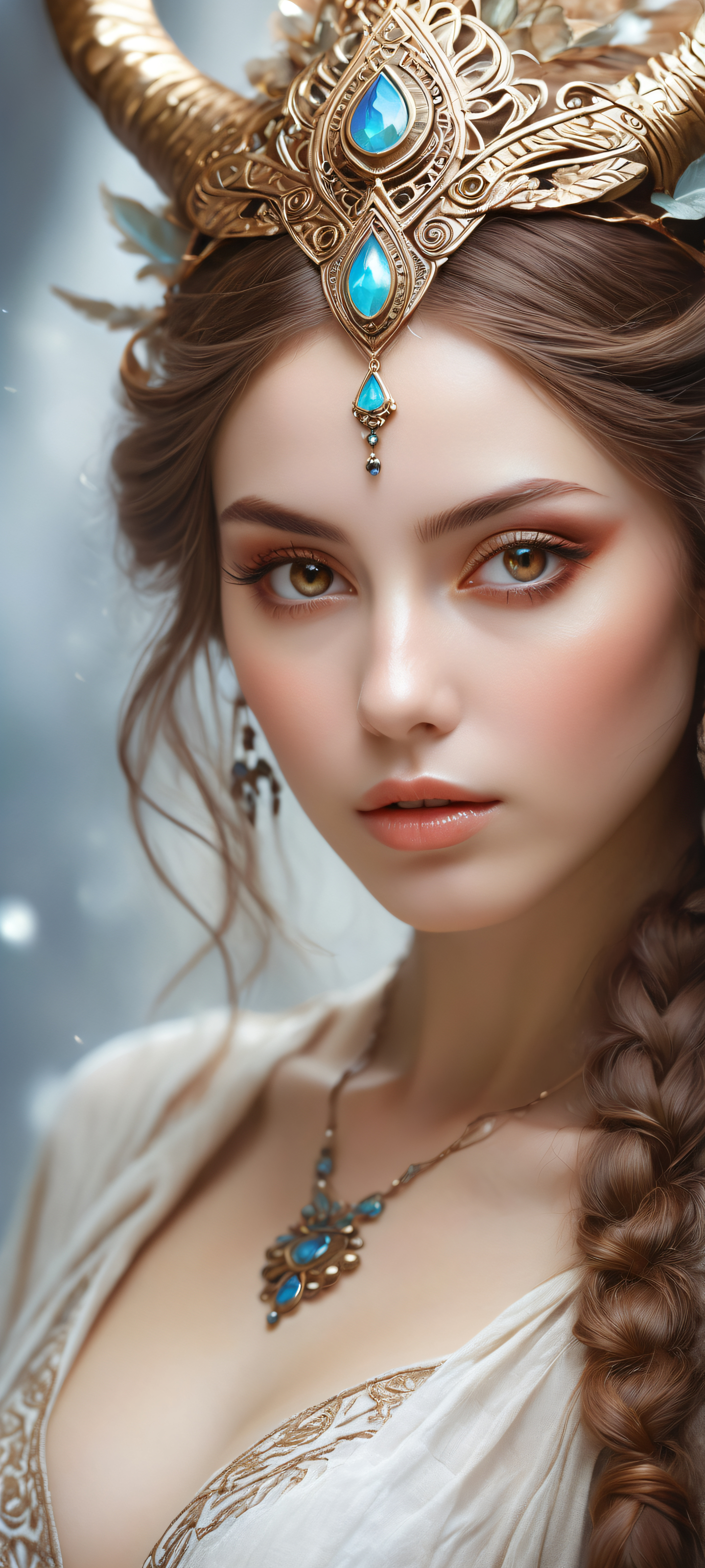 Indulge in this breathtaking vertical portrait artwork of a mystical maiden, perfectly optimized for your iPhone, Samsung Galaxy, or Android home screen. Her long, brown hair flows down her back as she gazes out into the vast, pure void, drawing you in with her ethereal aura and radiant colors.