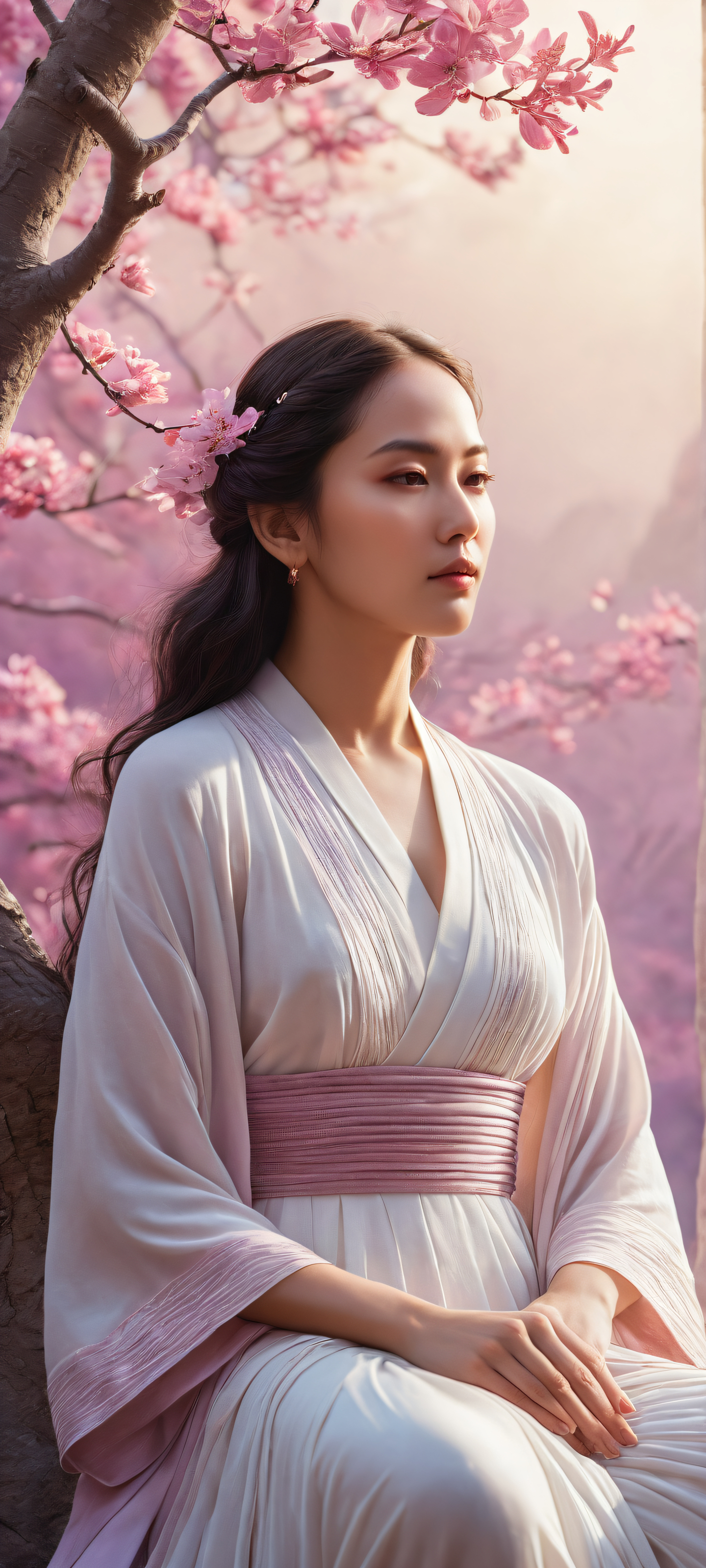 Step into a world of serenity with this breathtaking vertical portrait artwork of an ethereal maiden. Her tranquil sitting area is adorned with delicate folds and subtle textures, perfectly complemented by the vast, pure void above. The misty background features soft, feathery textures that blend seamlessly into the brilliant colors and radiant lighting, creating a dreamy atmosphere evoking feelings of tranquility.