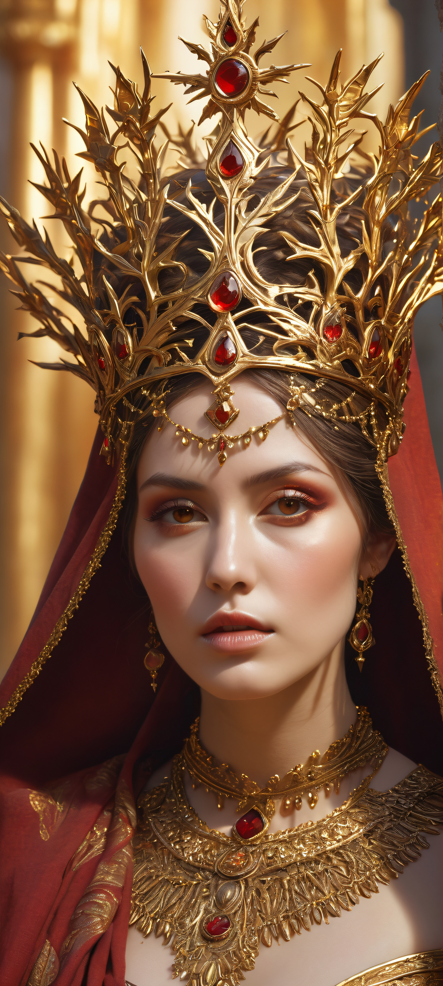 A breathtaking portrait of a central figure in a golden crown and tattered robes, with intricate micro-details and ethereal lighting. Perfect for iPhone and Android home screens.