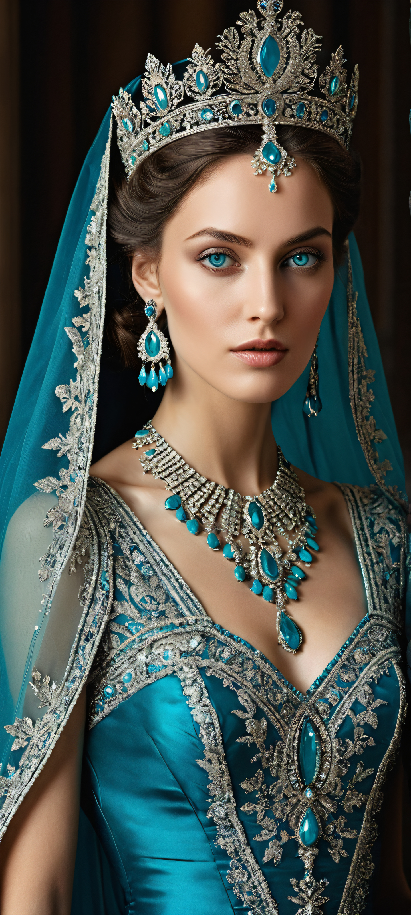A breathtaking vertical portrait artwork of A regal queen, placed in the lower-middle with insane micro-details, her piercing turquoise-blue eyes radiate an otherworldly intensity, surrounded by intricate metallic and translucent crown details., Perfectly clean and empty top half with vast pure void, a dramatic contrast to the intricately detailed queen and her dark teal-blue gown., Award-winning digital art, pristine clarity, and stunning visual impact, Soft natural window light from the side creates gentle shadows, adding depth and dimensionality to the scene without overpowering the subject’s ethereal beauty., Dominant colors include pale luminous skin tones, striking turquoise-blue eyes, deep jewel-like accents, and a subtle dark teal-blue hue for the gown, all set against a backdrop of perfect black., elegant low-key lighting, deep perfect blacks, striking contrast, sleek dark mode aesthetic, luminescent accents, deep rich colors, portrait composition, centered subject in the lower middle, perfectly clean and smooth top half for UI, extreme depth of field blurred background, highly textured surfaces, intricate micro-details, physically based rendering, award-winning digital art, epic breathtaking scale, stunning visual impact, perfect composition, macOS wallpaper aesthetic, masterpiece, 2K QHD resolution, 9:20 aspect ratio.