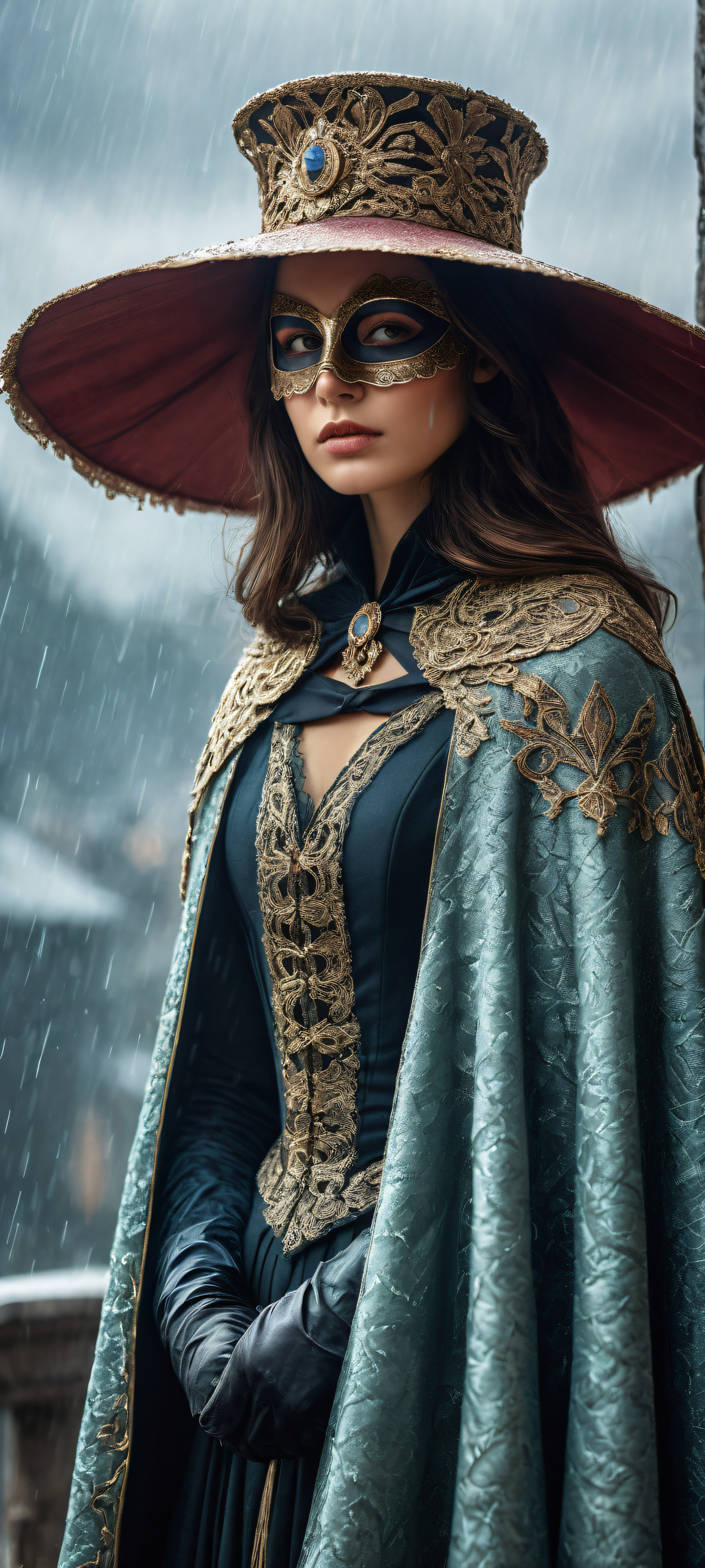 A breathtaking vertical portrait artwork of A 1800s masked hero with a sad face, placed in the lower-middle, intricate micro-details of her cape and floppy hat., A perfectly clean and empty top half with vast pure void, slowly giving way to the atmospheric rain in the background., Award-winning digital art, stunning visual impact with pristine clarity., Ethereal lighting with brilliant colors and ray-traced reflections, illuminating the scene with a sense of melancholy., #C9E4CA #8B9467 #66CCCC, ethereal lighting, radiant, brilliant colors, ray traced reflections, pristine clarity, portrait composition, centered subject in the lower middle, perfectly clean and smooth top half for UI, extreme depth of field blurred background, highly textured surfaces, intricate micro-details, physically based rendering, award-winning digital art, epic breathtaking scale, stunning visual impact, perfect composition, macOS wallpaper aesthetic, masterpiece, 2K QHD resolution, 9:20 aspect ratio.