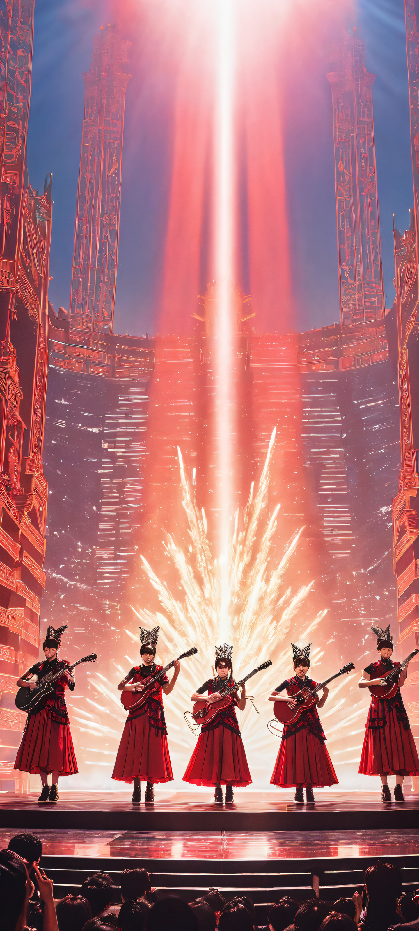 Immerse yourself in this breathtaking digital artwork, perfectly optimized for your iPhone, Samsung Galaxy, or Android home screen. The mesmerizing performance of Babymetal takes center stage, set against a stunning cityscape backdrop, creating a sense of depth and energy.