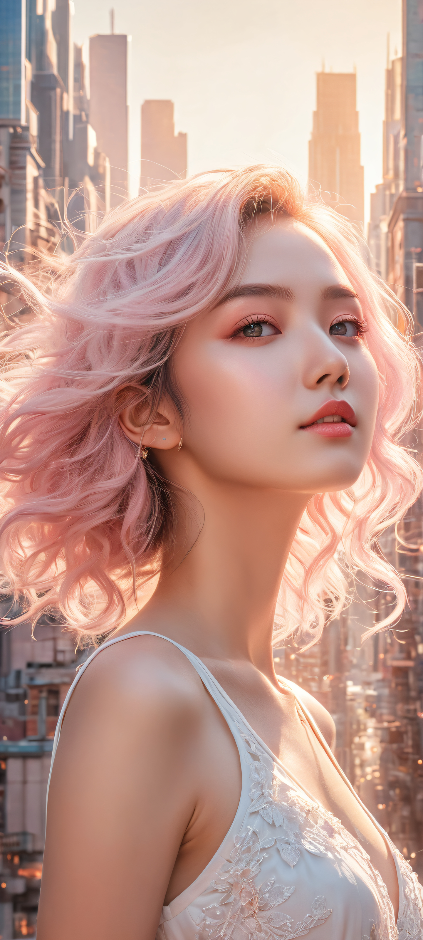 A breathtaking vertical portrait artwork of A beautifully detailed anime girl placed in the lower-middle with insane micro-details of intricate hair and eye accessories, Perfectly clean and empty top half with vast pure void, and a subtle gradient transitioning to the bottom half showcasing an anime-inspired cityscape or landscape, Award-winning digital art, stunning visual impact, and pristine clarity with a touch of modern flair, Ethereal, radiant lighting with brilliant colors, ray-traced reflections, and pristine clarity, as if lit by soft sunlight or gentle moonbeams, [‘Pastel Pink’, ‘Soft Peach’, ‘Creamy White’], ethereal lighting, radiant, brilliant colors, ray traced reflections, pristine clarity, portrait composition, centered subject in the lower middle, perfectly clean and smooth top half for UI, extreme depth of field blurred background, highly textured surfaces, intricate micro-details, physically based rendering, award-winning digital art, epic breathtaking scale, stunning visual impact, perfect composition, macOS wallpaper aesthetic, masterpiece, 2K QHD resolution, 9:20 aspect ratio.