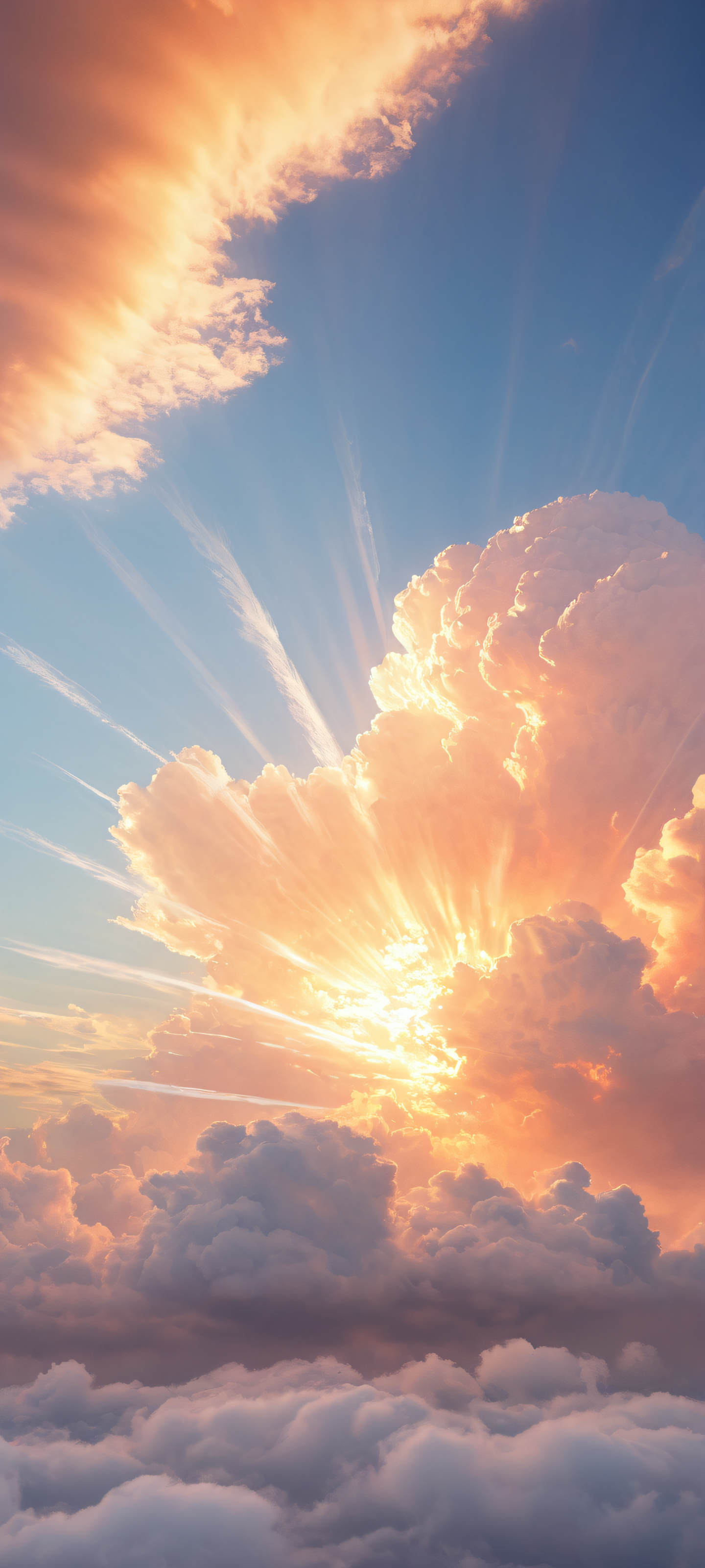 A breathtaking vertical portrait artwork of Cloud formations placed in the lower-middle, intricate micro-details of wispy cirrus strands and delicate vapor trails, A vast, perfectly clean and empty top half with a pure void background, allowing UI widgets to breathe effortlessly, Award-winning digital art with a focus on pristine clarity, showcasing stunning visual impact through precision-crafted vector elements, Ethereal sunlight casting an array of warm, radiant rays across the cloud formations, with subtle ray traced reflections adding depth and dimensionality, [‘#FFC080’, ‘#FFFFFF’], ethereal lighting, radiant, brilliant colors, ray traced reflections, pristine clarity, portrait composition, centered subject in the lower middle, perfectly clean and smooth top half for UI, extreme depth of field blurred background, highly textured surfaces, intricate micro-details, physically based rendering, award-winning digital art, epic breathtaking scale, stunning visual impact, perfect composition, macOS wallpaper aesthetic, masterpiece, 2K QHD resolution, 9:20 aspect ratio.