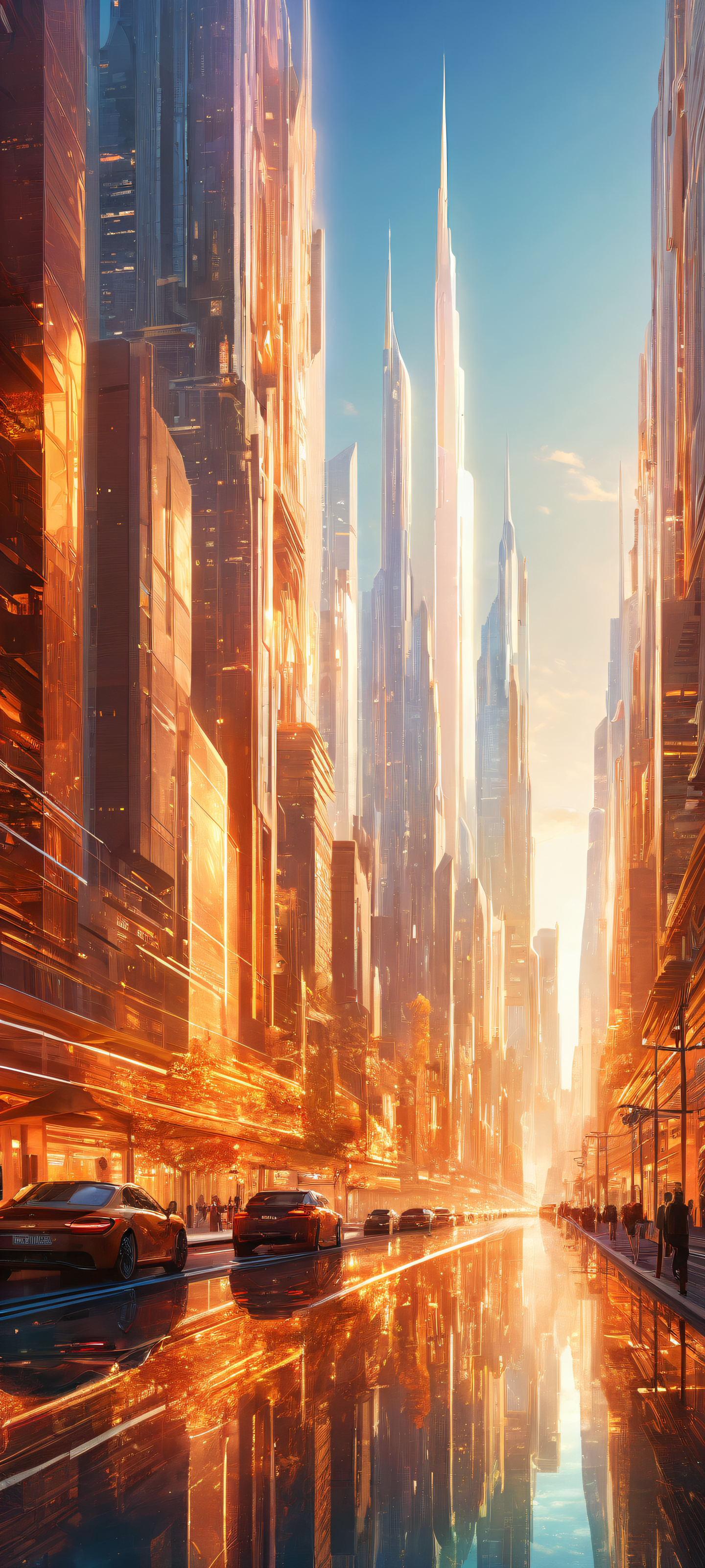 A futuristic cityscape artwork for iPhone and Android, with radiant colors and intricate details.