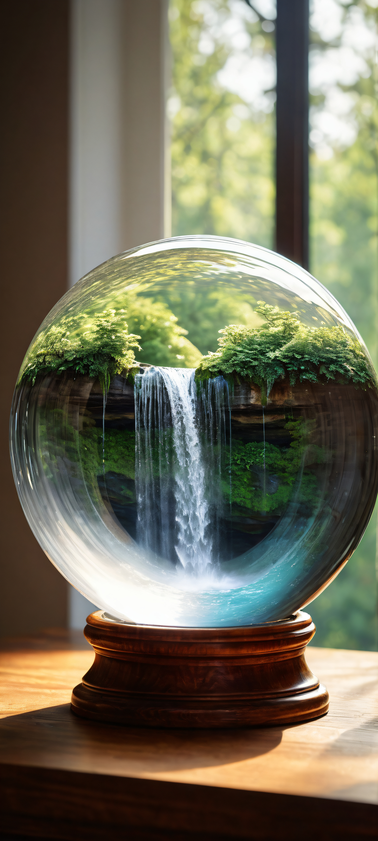 A breathtaking vertical portrait artwork of A serene waterfall, placed in the lower-middle with insane micro-details, pouring into the room from within a crystal ball sitting on an old worn wooden table., Perfectly clean and empty top half with vast pure void, allowing for seamless integration with iOS widgets; the bottom half features a worn wooden table with a crystal ball containing the mesmerizing waterfall., Award-winning digital art, pristine clarity, and stunning visual impact, reminiscent of Apple UI level quality., Ethereal, radiant lighting with brilliant colors and ray-traced reflections, casting a warm glow on the surrounding environment and creating an inviting atmosphere., #8BC34A, ethereal lighting, radiant, brilliant colors, ray traced reflections, pristine clarity, portrait composition, centered subject in the lower middle, perfectly clean and smooth top half for UI, extreme depth of field blurred background, highly textured surfaces, intricate micro-details, physically based rendering, award-winning digital art, epic breathtaking scale, stunning visual impact, perfect composition, macOS wallpaper aesthetic, masterpiece, 2K QHD resolution, 9:20 aspect ratio.