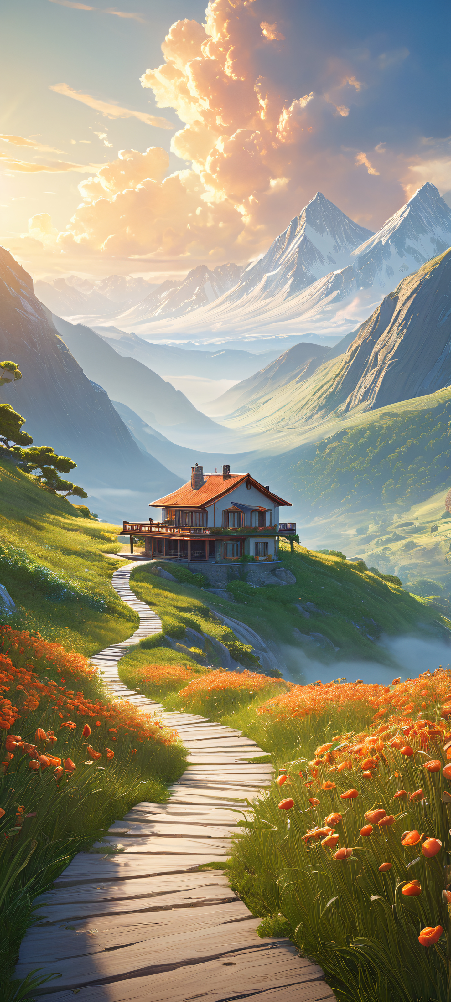 Get ready to be transported to an otherworldly realm with this breathtaking vertical portrait artwork. Perfectly optimized for your iPhone, Samsung Galaxy, or Android home screen, this masterpiece features a serene landscape with a winding path, lush nature, and a majestic sky. The combination of ethereal lighting, radiant colors, and ray-traced reflections creates a stunning visual impact that will leave you breathless.
