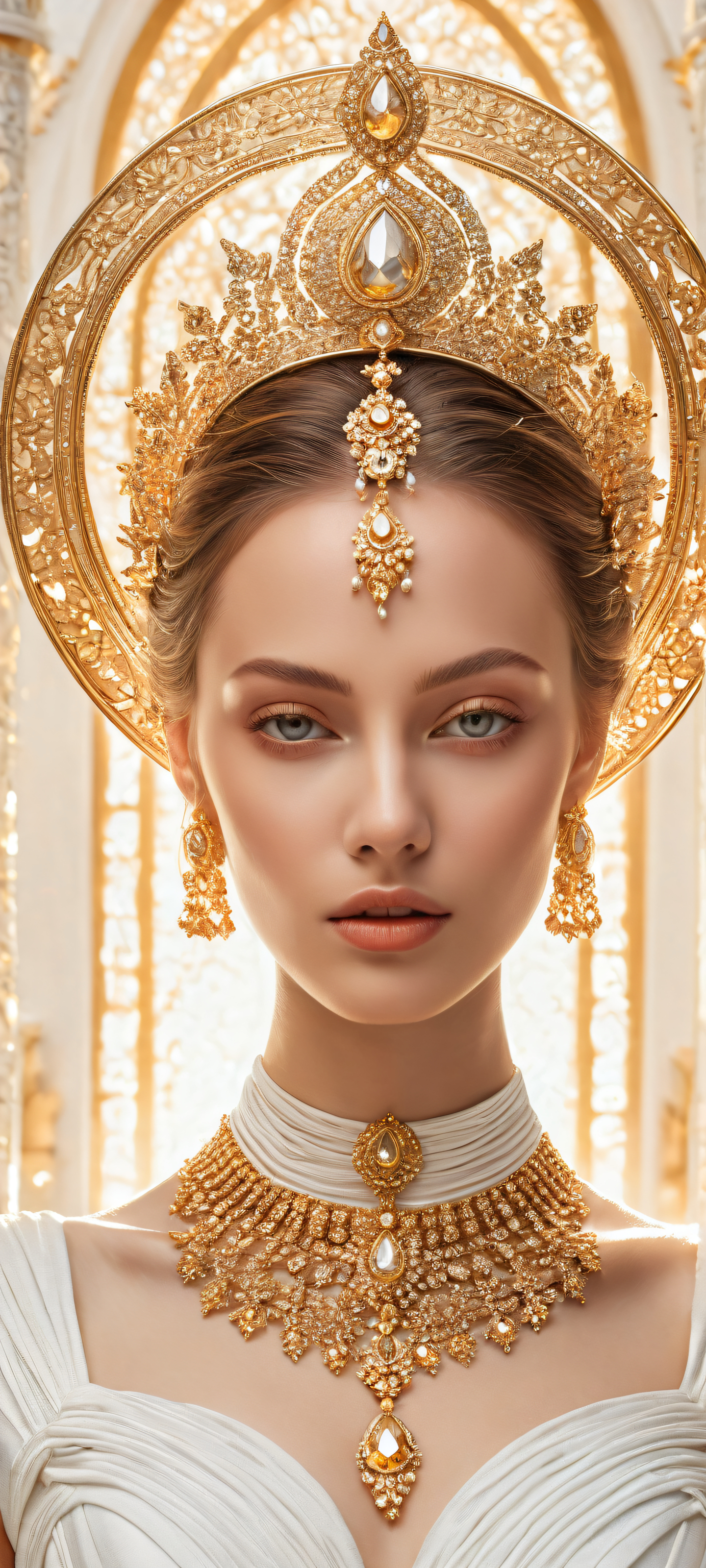 A breathtaking vertical portrait artwork of A prestigious woman dressed in an all-white dress, placed in the lower-middle with intricate micro-details, such as luxurious gold trim and planetary texture on her head sphere., Perfectly clean and empty top half with vast pure void, allowing for a seamless UI integration, and a glass-like background that subtly hints at illumination., Award-winning digital art, stunning visual impact, with a focus on realism, vibrant colors, and pristine clarity., Ethereal lighting with radiant, brilliant colors, ray-traced reflections, and impeccable clarity, creating an otherworldly ambiance., Dominant color palette featuring soft whites, warm tans, and shimmering golds, evoking a sense of opulence and sophistication., ethereal lighting, radiant, brilliant colors, ray traced reflections, pristine clarity, portrait composition, centered subject in the lower middle, perfectly clean and smooth top half for UI, extreme depth of field blurred background, highly textured surfaces, intricate micro-details, physically based rendering, award-winning digital art, epic breathtaking scale, stunning visual impact, perfect composition, macOS wallpaper aesthetic, masterpiece, 2K QHD resolution, 9:20 aspect ratio.