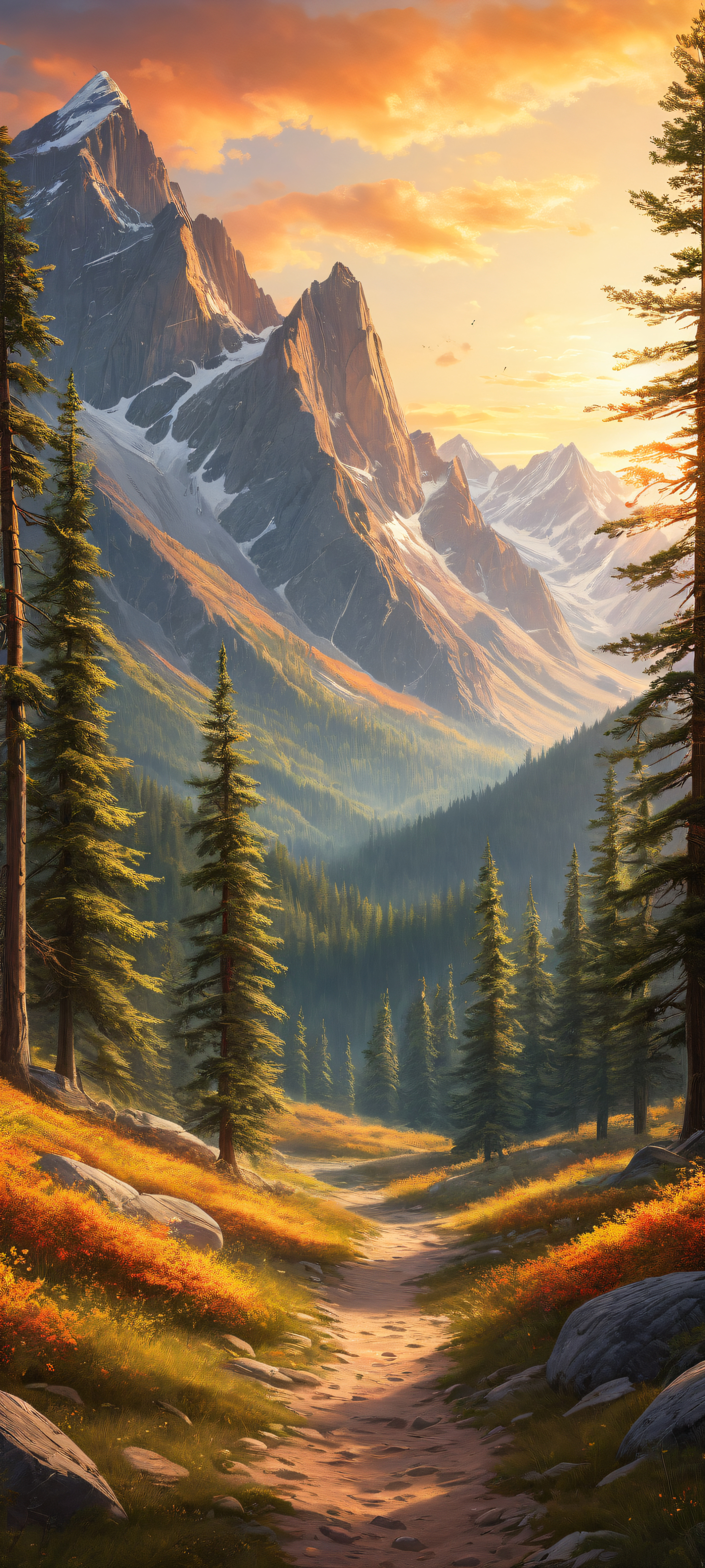 This breathtaking digital art masterpiece is specifically optimized to perfectly integrate with iPhone, Samsung Galaxy, and Android home screens. The majestic mountain range takes center stage in the lower-middle, surrounded by lush forest foliage and sun-kissed trees, while the top half remains crisp and clean for seamless widget integration. Pristine clarity and depth-defying dimensionality make this artwork a must-have for any nature lover’s mobile device.