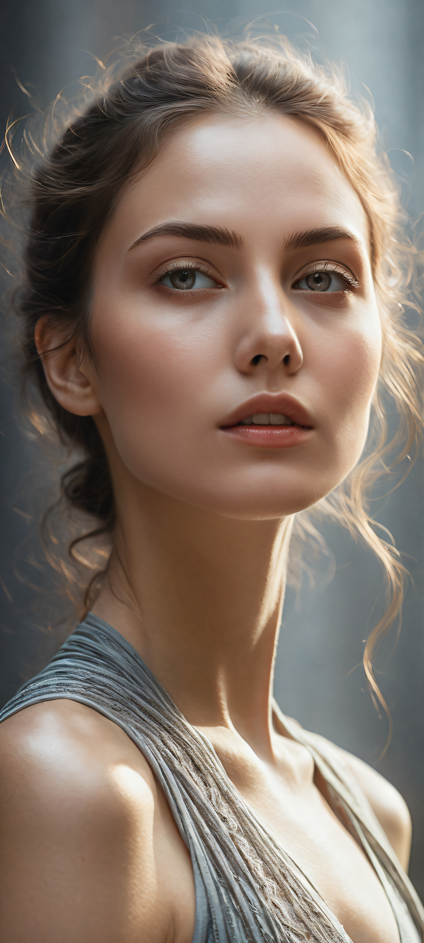 A breathtaking vertical portrait artwork of A young Caucasian woman placed in the lower-middle with insane micro-details., Perfectly clean and empty top half with vast pure void, flowing smoothly in color and tone., Award-winning digital art, stunning visual impact, almost sculptural, abstract style with free, gestural brushstrokes., Diffused, low-angle shot following the two-thirds rule composition captures a radiant, brilliant, ethereal lighting., Muted palette with dark tones, subtle variations in tone and slight hint of bright colors to create depth., ethereal lighting, radiant, brilliant colors, ray traced reflections, pristine clarity, portrait composition, centered subject in the lower middle, perfectly clean and smooth top half for UI, extreme depth of field blurred background, highly textured surfaces, intricate micro-details, physically based rendering, award-winning digital art, epic breathtaking scale, stunning visual impact, perfect composition, macOS wallpaper aesthetic, masterpiece, 2K QHD resolution, 9:20 aspect ratio.