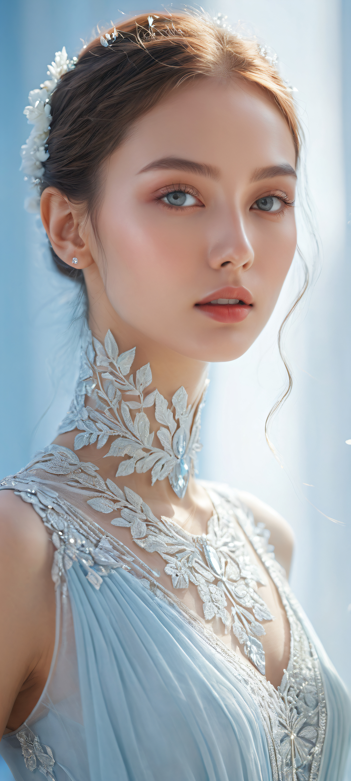A breathtaking vertical portrait artwork of The subject is placed in the lower-middle with intricate micro-details, Perfectly clean and empty top half with vast pure void, reflecting subtle textures and scales, Award-winning digital art, stunning visual impact, and pristine clarity, Ethereal lighting: radiant, brilliant colors, ray-traced reflections, and crystal-clear clarity. Bright and airy., [‘Soft Pastel Hues’, ‘Whispery White’, ‘Airy Blue’], ethereal lighting, radiant, brilliant colors, ray traced reflections, pristine clarity, portrait composition, centered subject in the lower middle, perfectly clean and smooth top half for UI, extreme depth of field blurred background, highly textured surfaces, intricate micro-details, physically based rendering, award-winning digital art, epic breathtaking scale, stunning visual impact, perfect composition, macOS wallpaper aesthetic, masterpiece, 2K QHD resolution, 9:20 aspect ratio.