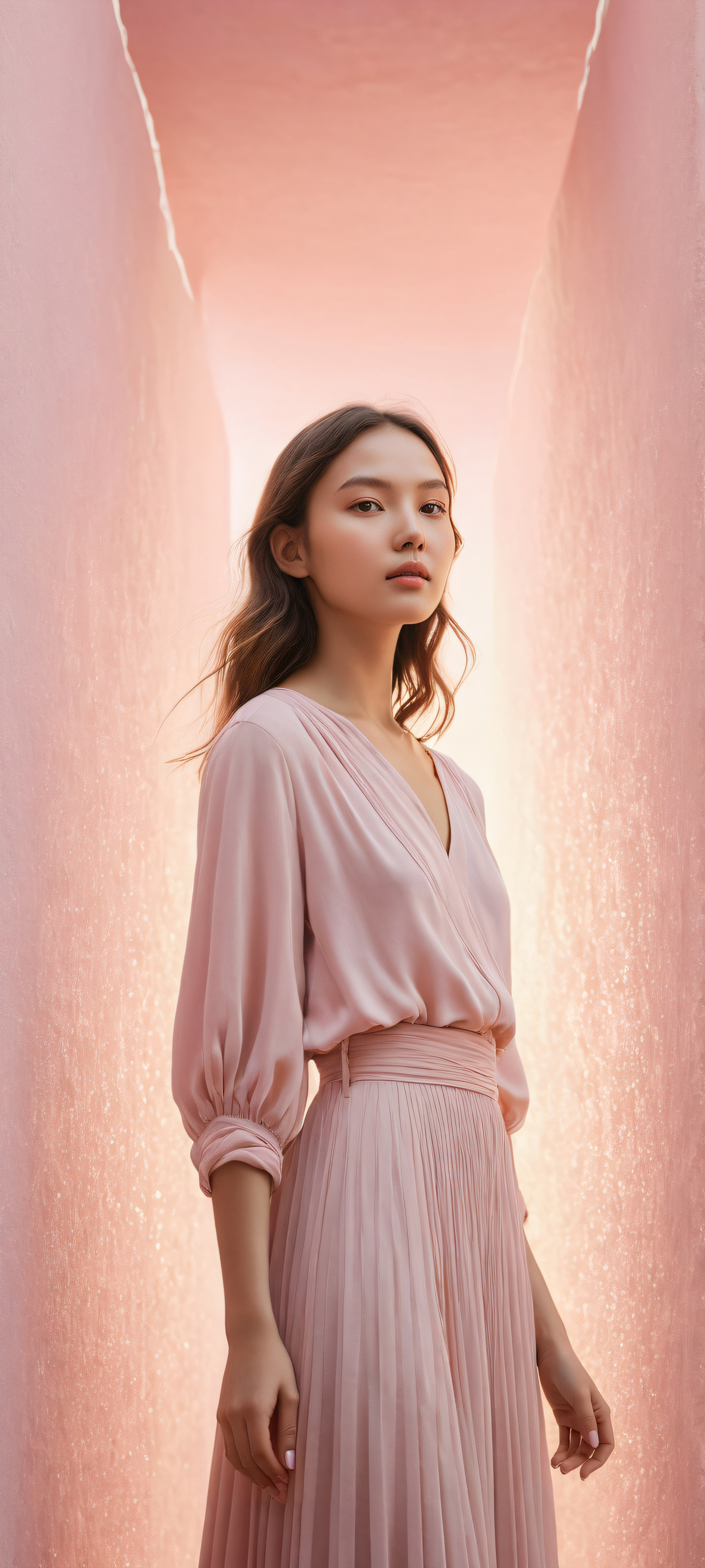 A breathtaking vertical portrait artwork of One young girl placed in the lower-middle, intricate micro-details of her surroundings with insane depth of field., Perfectly clean and empty top half with vast pure void, allowing for seamless interaction with UI widgets. The bottom half is a highly detailed, volumetric environment that creates a sense of depth and immersion., Award-winning digital art, stunning visual impact, and pristine clarity, reminiscent of high-end cinematic productions., Ethereal lighting with radiant, brilliant colors, ray-traced reflections, and pristine clarity, creating an otherworldly atmosphere., #F7F6F4 (Soft Pastel Pink) and #C5C3B9 (Creamy Beige), ethereal lighting, radiant, brilliant colors, ray traced reflections, pristine clarity, portrait composition, centered subject in the lower middle, perfectly clean and smooth top half for UI, extreme depth of field blurred background, highly textured surfaces, intricate micro-details, physically based rendering, award-winning digital art, epic breathtaking scale, stunning visual impact, perfect composition, macOS wallpaper aesthetic, masterpiece, 2K QHD resolution, 9:20 aspect ratio.
