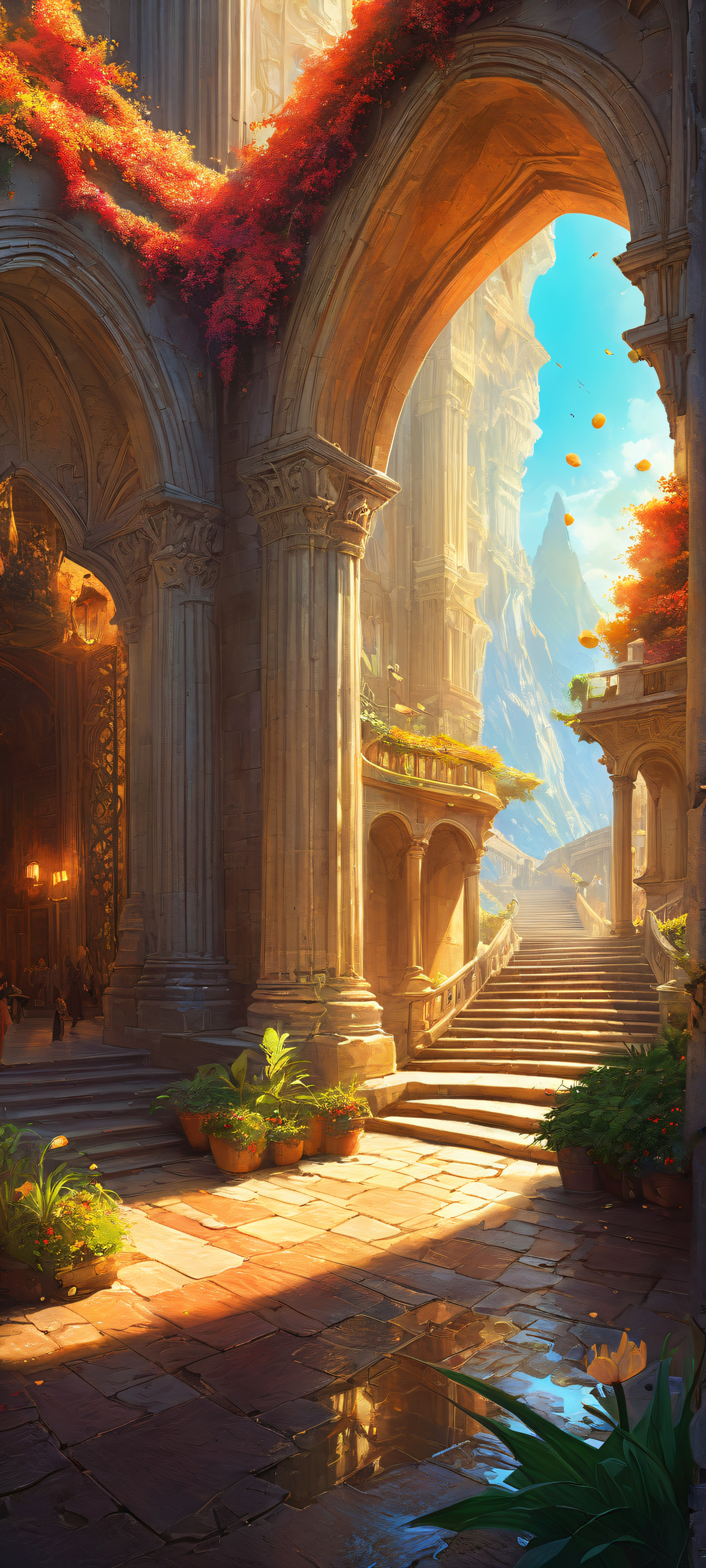 iPhone and Android mobile phone wallpaper featuring a stunning fantasy landscape with high-contrast colors, vibrant textures, and ray-traced reflections.
