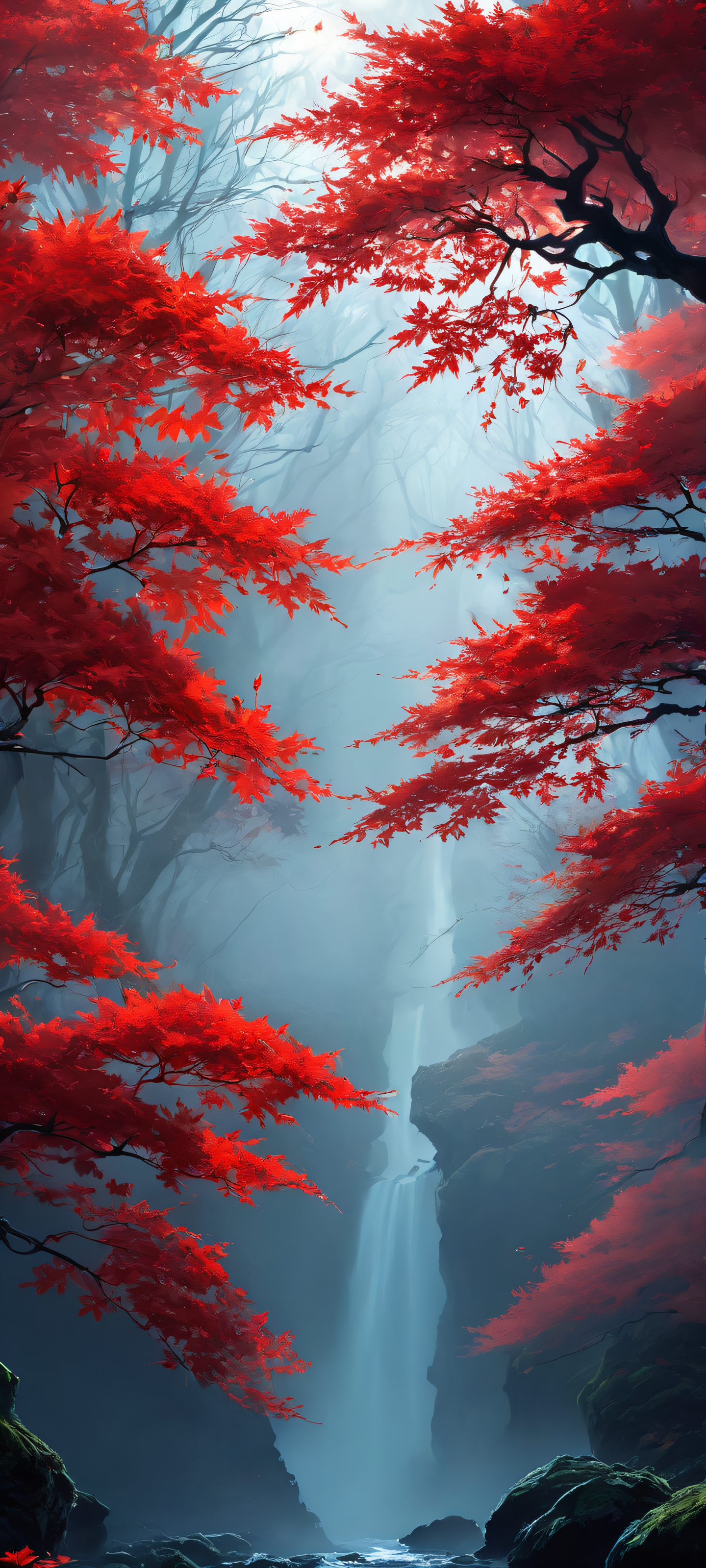 Unlock the mystique of nature with this stunning vertical mobile phone wallpaper. Perfectly optimized for your iPhone, Samsung Galaxy, or Android home screen, this masterpiece features intricately detailed glowing red leaves against a deep red and dark backdrop. Let the beauty of the Druid’s world transport you to a realm of tranquility.