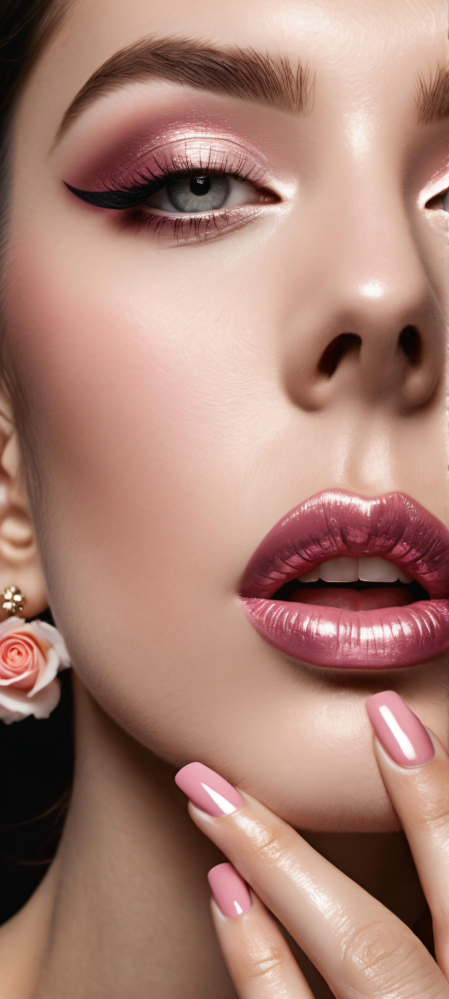 A breathtaking vertical portrait artwork of A single girl placed in the lower-middle with a delicate pink rose and intricate micro-details on her nail polish and lipstick, Perfectly clean and empty top half with vast pure void, featuring the subject prominently, Award-winning digital art, pristine clarity, showcasing exquisite details and textures, Sleek dark mode aesthetic, deep perfect blacks, striking crisp contrast, and elegant luminescent accents, Soft pink and creamy whites, accented by subtle metallic sheens, elegant low-key lighting, deep perfect blacks, striking contrast, sleek dark mode aesthetic, luminescent accents, deep rich colors, portrait composition, centered subject in the lower middle, perfectly clean and smooth top half for UI, extreme depth of field blurred background, highly textured surfaces, intricate micro-details, physically based rendering, award-winning digital art, epic breathtaking scale, stunning visual impact, perfect composition, macOS wallpaper aesthetic, masterpiece, 2K QHD resolution, 9:20 aspect ratio.