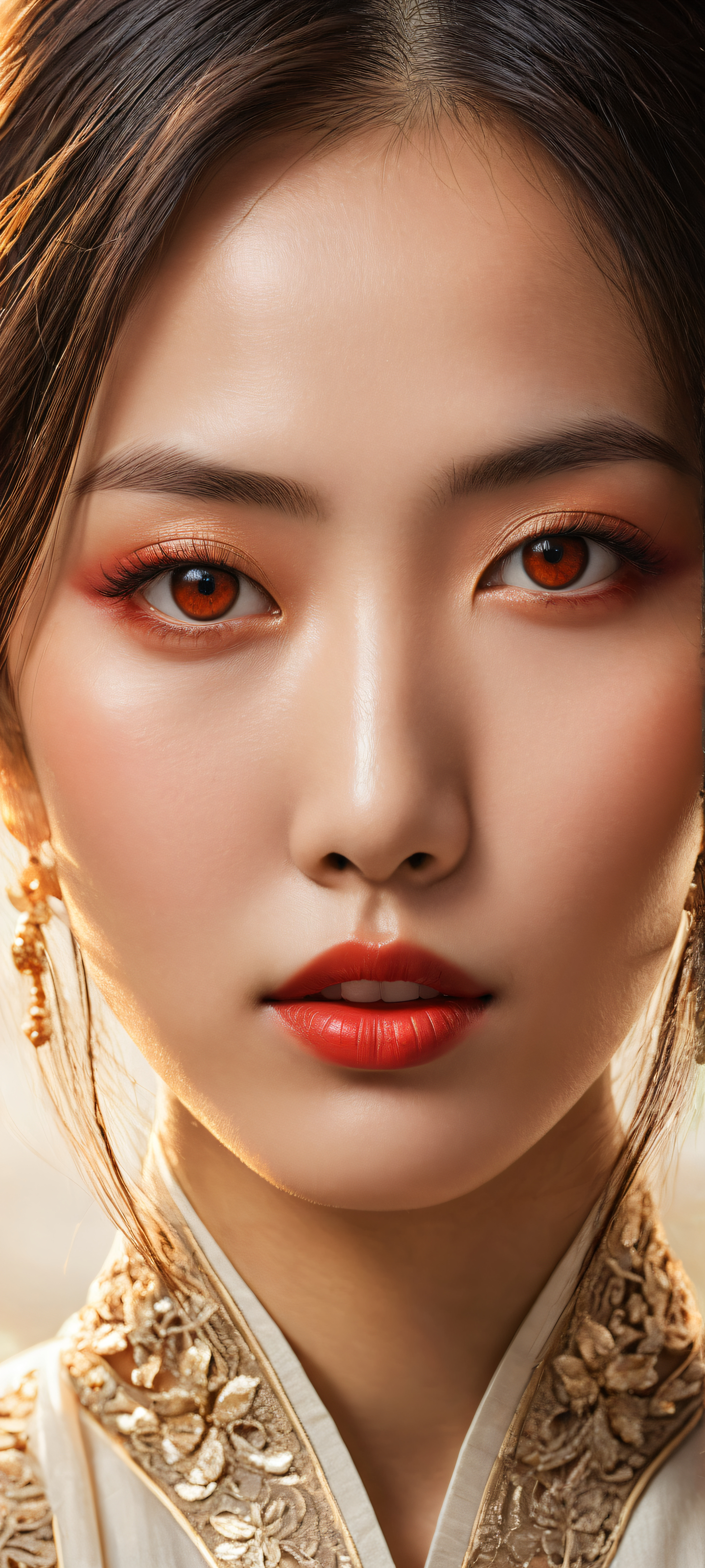 A breathtaking vertical portrait artwork of A serene Asian woman placed in the lower-middle, intricate micro-details of her long hair, bangs, and closed mouth, with radiant red eyes that seem to be looking directly at the viewer., Perfectly clean and empty top half with vast pure void, providing ample breathing space for UI widgets, while the bottom half is filled with intricate details and reflections that invite exploration., Award-winning digital art with a focus on pristine clarity, showcasing stunning visual impact and a masterful blend of texture and scale reminiscent of Apple UI design., Ethereal sunlight casting a warm glow on the subject’s face, with ray-traced reflections adding depth and dimensionality to her long hair and the surrounding environment., #FFC080 (Warm Beige), #8B4513 (Earth Brown), #9A8654 (Mocha Brown) – A palette that exudes serenity, warmth, and inviting calmness., ethereal lighting, radiant, brilliant colors, ray traced reflections, pristine clarity, portrait composition, centered subject in the lower middle, perfectly clean and smooth top half for UI, extreme depth of field blurred background, highly textured surfaces, intricate micro-details, physically based rendering, award-winning digital art, epic breathtaking scale, stunning visual impact, perfect composition, macOS wallpaper aesthetic, masterpiece, 2K QHD resolution, 9:20 aspect ratio.