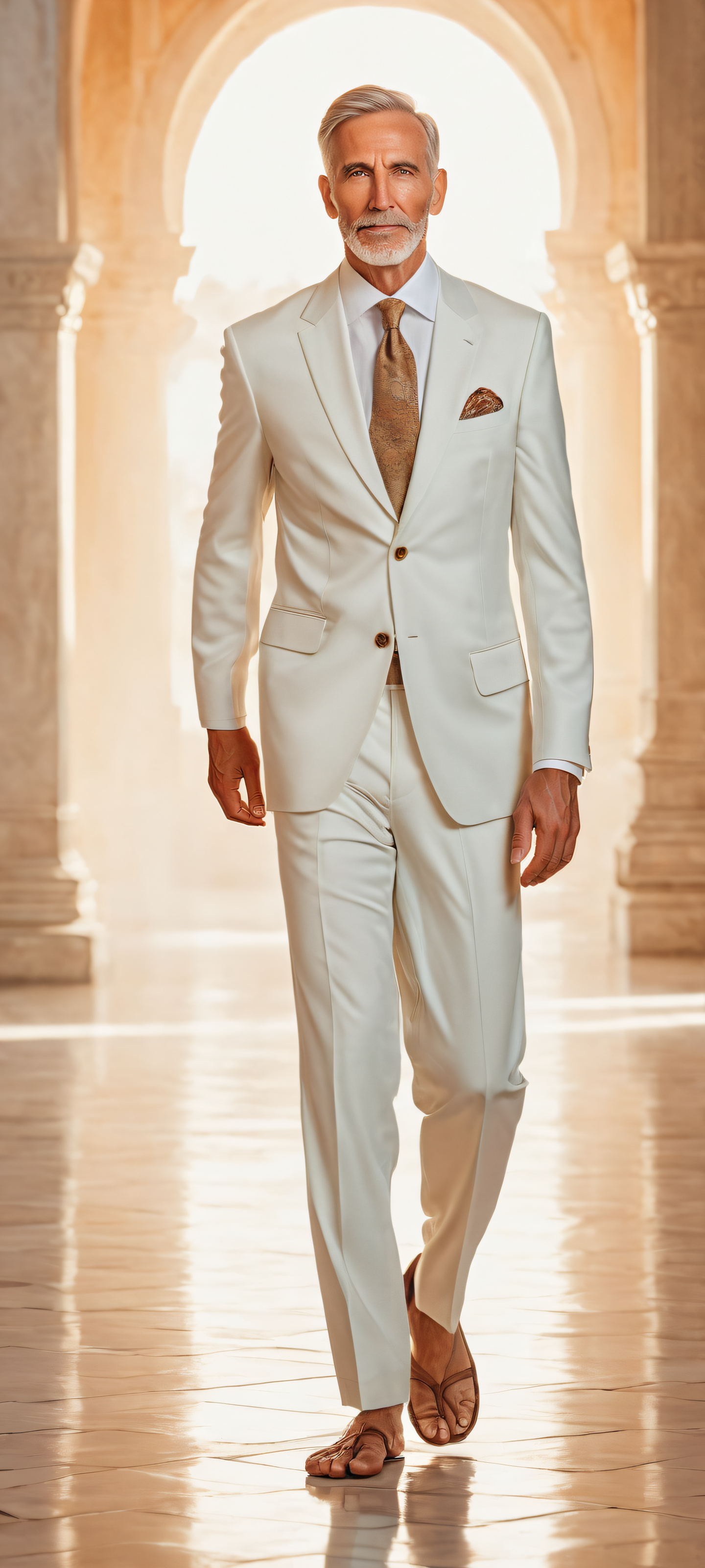 A breathtaking vertical portrait artwork of A handsome, mature individual placed in the lower-middle with intricate micro-details on their feet and attire, showcasing amazing quality., Perfectly clean and empty top half with vast pure void, while the background features soft, gentle watercolor (medium) hues., Award-winning digital art, stunning visual impact, and pristine clarity., Ethereal lighting with radiant, brilliant colors, ray-traced reflections, and pristine clarity, creating a bright and airy atmosphere., #F7D2C4, #C9E4CA, #87A8B5, ethereal lighting, radiant, brilliant colors, ray traced reflections, pristine clarity, portrait composition, centered subject in the lower middle, perfectly clean and smooth top half for UI, extreme depth of field blurred background, highly textured surfaces, intricate micro-details, physically based rendering, award-winning digital art, epic breathtaking scale, stunning visual impact, perfect composition, macOS wallpaper aesthetic, masterpiece, 2K QHD resolution, 9:20 aspect ratio.