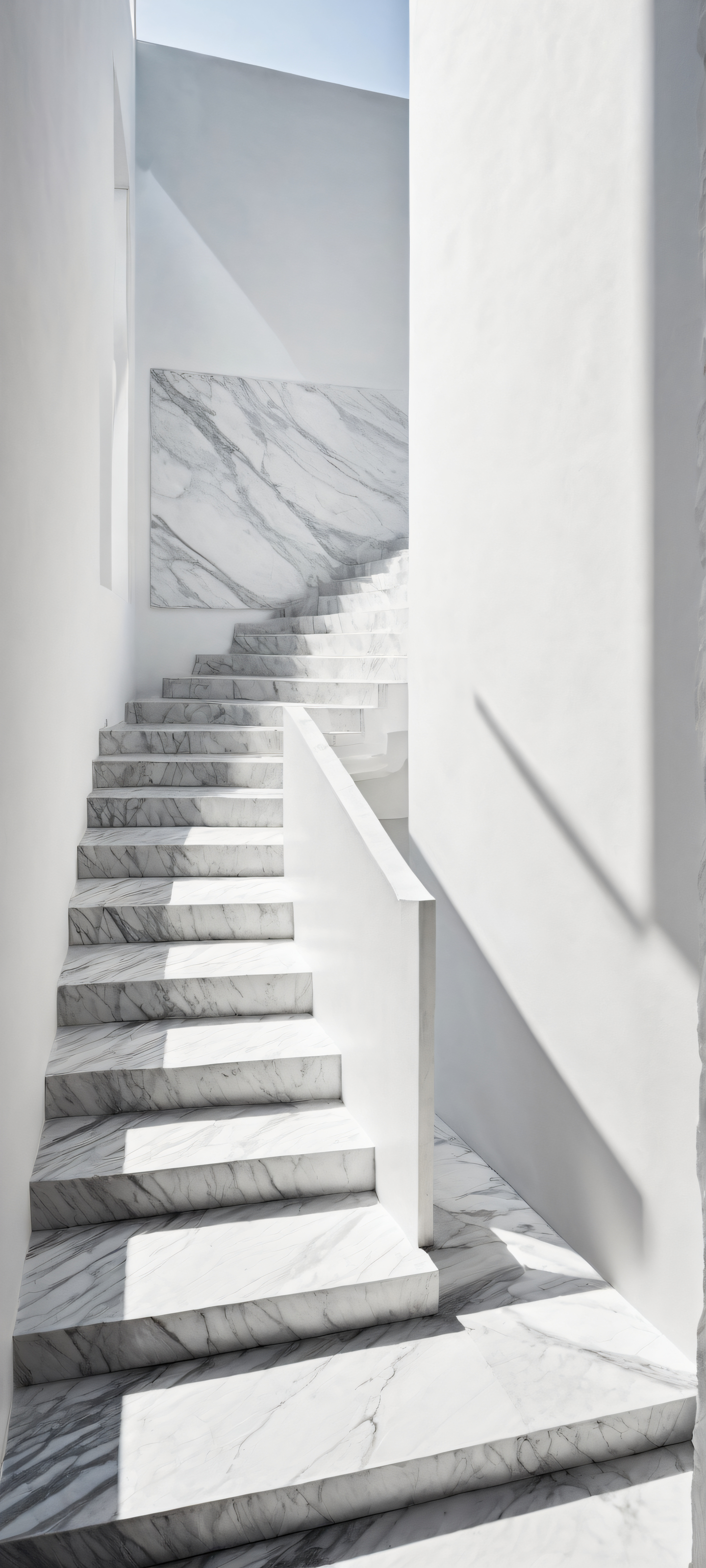 A breathtaking vertical portrait artwork of A lone figure pauses mid-step, body bisected by the contrast, casting two opposing shadows that stretch in opposite directions. placed in the lower-middle, intricate micro-details, Perfectly clean and empty top half with vast pure void; bottom half features a surreal landscape of an endlessly ascending staircase, perfectly divided down the center between marble steps on one side and rough obsidian steps on the other., Award-winning digital art, stunning visual impact, and pristine clarity, Ethereal lighting: radiant, brilliant monochrome colors, ray-traced reflections, and pristine clarity, Dominant color palette: high contrast monochrome with subtle texture, featuring white and black hues, ethereal lighting, radiant, brilliant colors, ray traced reflections, pristine clarity, portrait composition, centered subject in the lower middle, perfectly clean and smooth top half for UI, extreme depth of field blurred background, highly textured surfaces, intricate micro-details, physically based rendering, award-winning digital art, epic breathtaking scale, stunning visual impact, perfect composition, macOS wallpaper aesthetic, masterpiece, 2K QHD resolution, 9:20 aspect ratio.