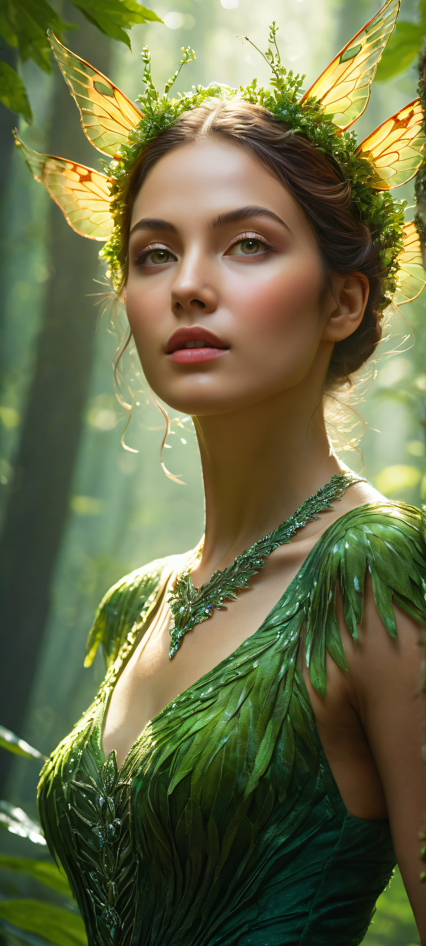 Get ready to be mesmerized by this breathtaking digital artwork, perfectly optimized for your iPhone, Samsung Galaxy, or Android home screen. The enchanting forest sprite is situated in the lower-middle, surrounded by lush greenery and ethereal softbox lighting that radiates brilliant colors and ray-traced reflections.