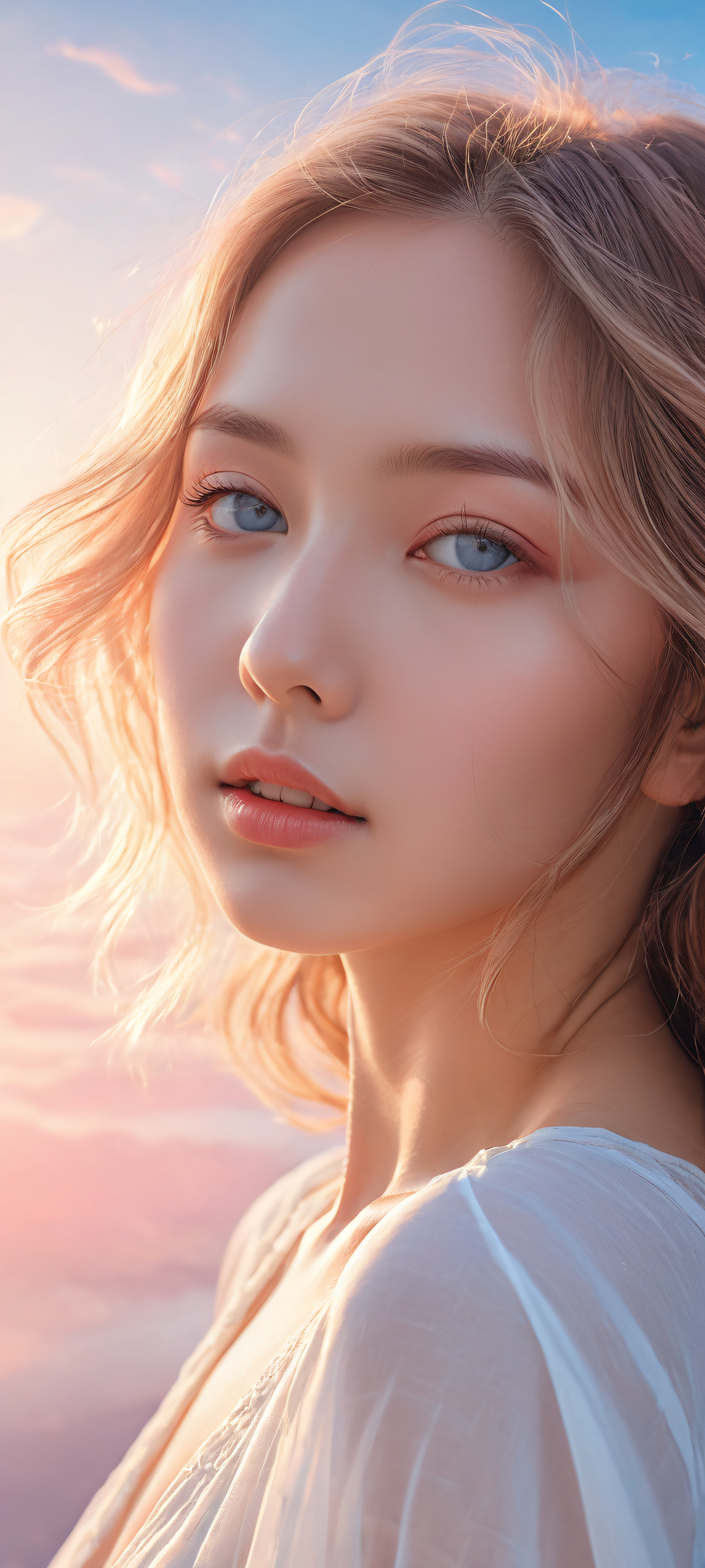 A breathtaking vertical portrait artwork of A young girl placed in the lower-middle with intricate micro-details of her relaxed pose and surroundings, Perfectly clean and empty top half with vast pure void, giving way to a serene background that subtly hints at the subject’s world, Award-winning digital art, pristine clarity, reminiscent of anime illustrations, Ethereal, cinematic lighting with volumetric effects, softly illuminating the subject from multiple angles, Delicate pastel shades of pink, blue, and white, reminiscent of a gentle sunrise or sunset, ethereal lighting, radiant, brilliant colors, ray traced reflections, pristine clarity, portrait composition, centered subject in the lower middle, perfectly clean and smooth top half for UI, extreme depth of field blurred background, highly textured surfaces, intricate micro-details, physically based rendering, award-winning digital art, epic breathtaking scale, stunning visual impact, perfect composition, macOS wallpaper aesthetic, masterpiece, 2K QHD resolution, 9:20 aspect ratio.