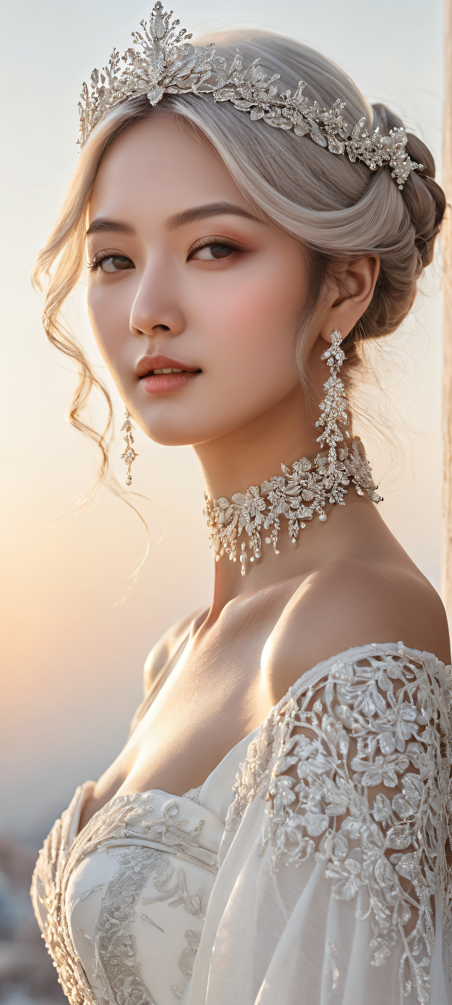 A breathtaking vertical portrait artwork of A delicate Suzuna, placed in the lower-middle with intricate micro-details, including a sparkling hair ornament and delicate folds on her Juliet sleeves, Perfectly clean and empty top half with a vast pure void, descending into a subtle gradient of creamy whites and soft grays, Award-winning digital art, featuring stunning visual impact and a focus on textures and scale that would rival Apple UI standards, Ethereal lighting, with bright highlights and radiant colors, as if illuminated by the soft glow of dawn, #FFFAF0 #C7D4E6 #F2F2F2, ethereal lighting, radiant, brilliant colors, ray traced reflections, pristine clarity, portrait composition, centered subject in the lower middle, perfectly clean and smooth top half for UI, extreme depth of field blurred background, highly textured surfaces, intricate micro-details, physically based rendering, award-winning digital art, epic breathtaking scale, stunning visual impact, perfect composition, macOS wallpaper aesthetic, masterpiece, 2K QHD resolution, 9:20 aspect ratio.