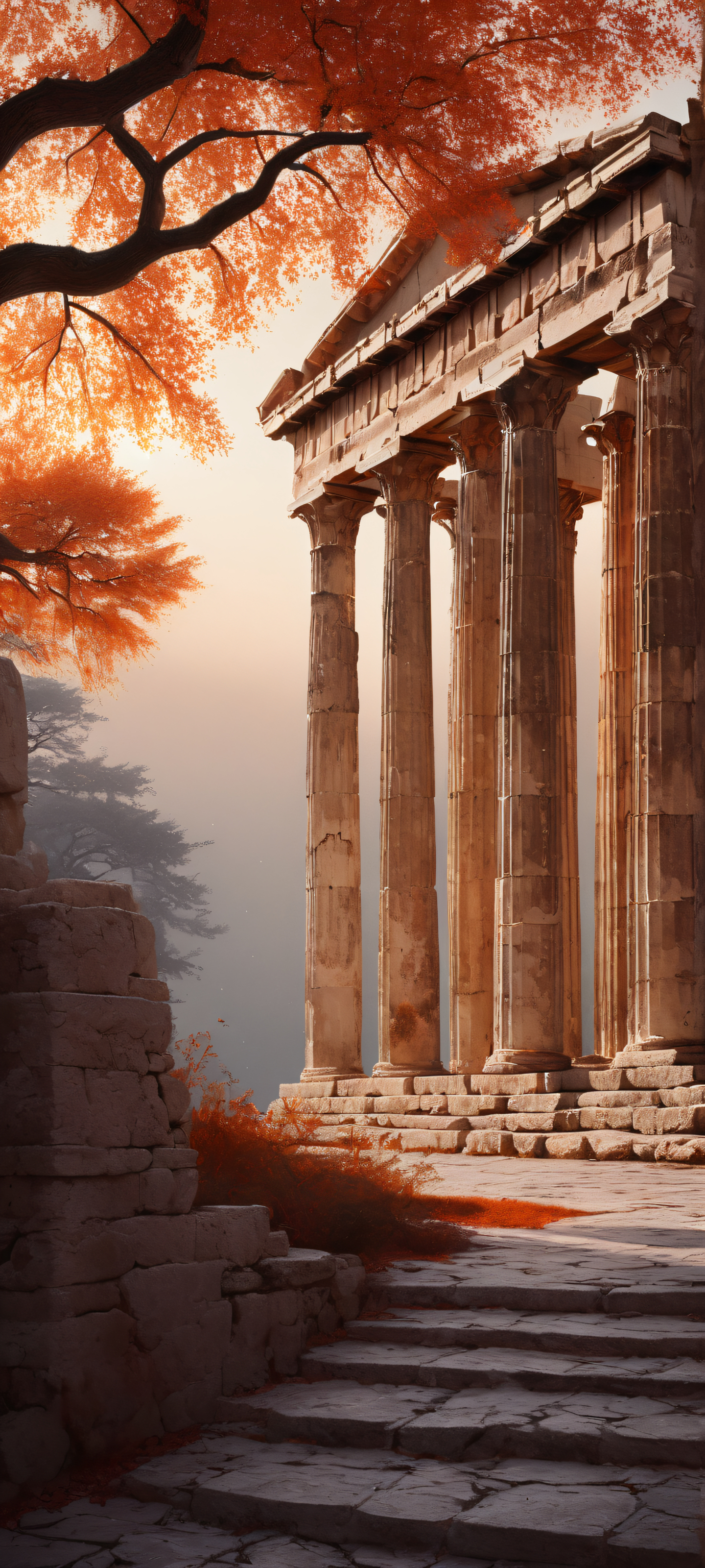Breathtaking vertical portrait artwork of a Greek Temple amidst a Gothic Dark Forest, perfectly optimized for iPhone and Android home screens.