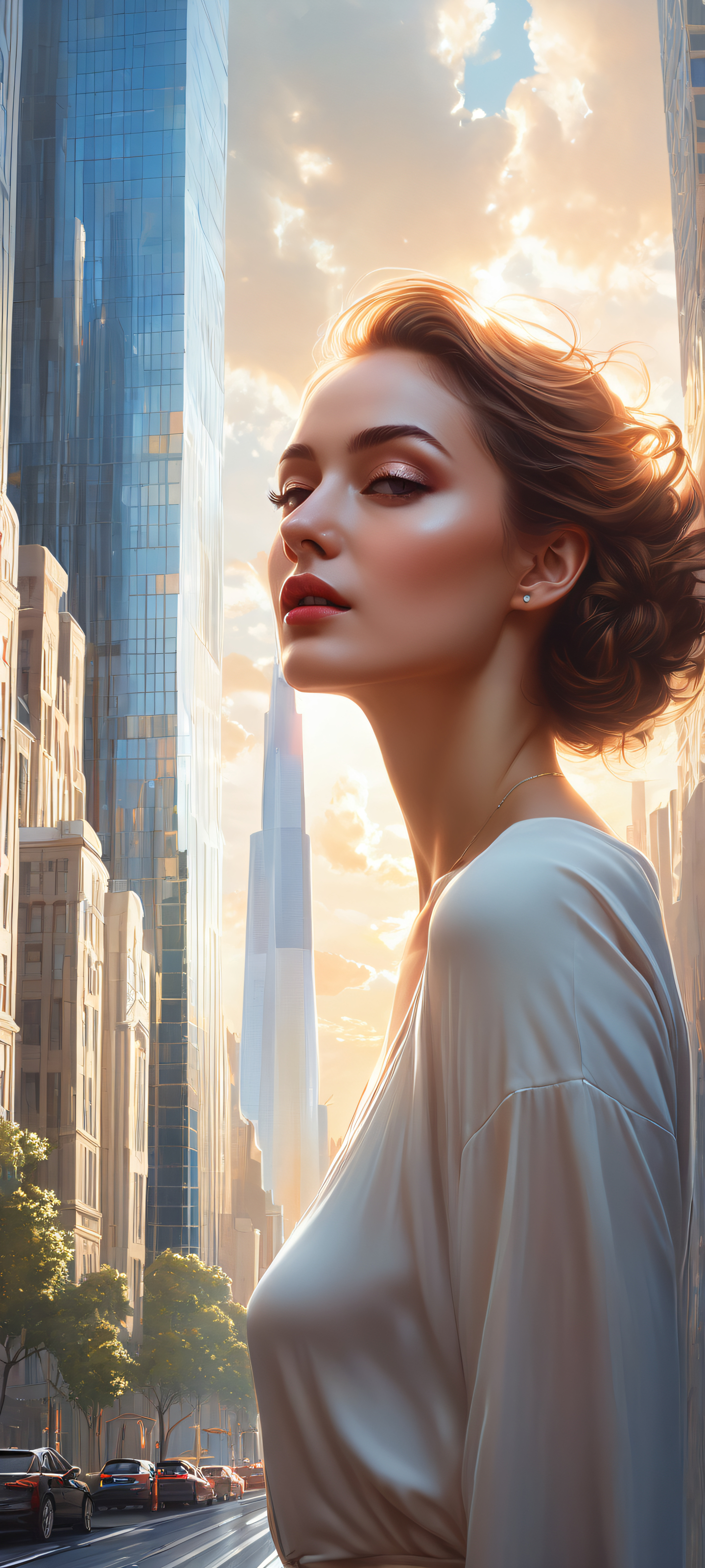 Immerse yourself in this breathtaking digital art masterpiece, perfectly optimized for your iPhone, Samsung Galaxy, or Android device’s home screen. The serene atmosphere and ultrawide cityscape create an epic visual impact, with a stunning woman standing out against the vibrant blue and white hues. This award-winning artwork is a must-have for any urban enthusiast.