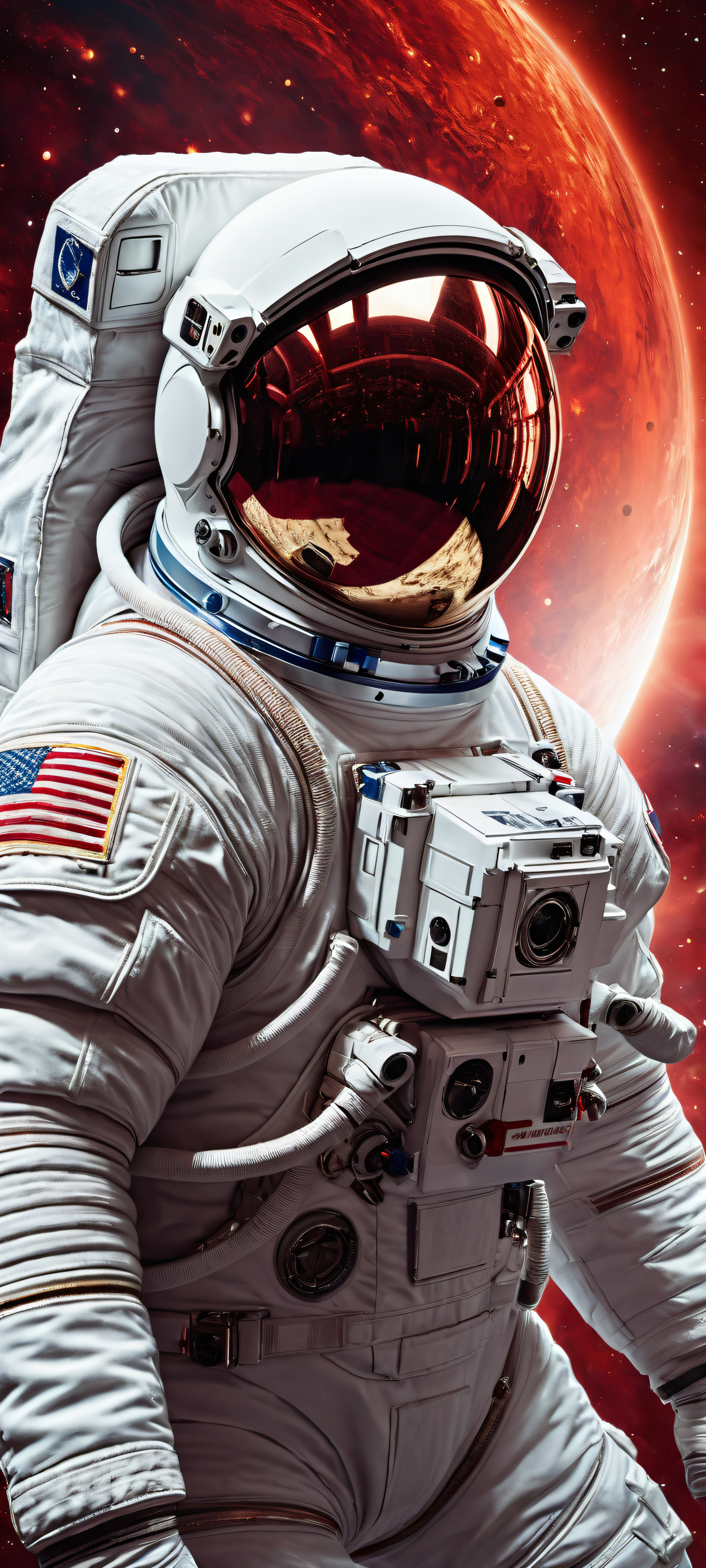 Astronaut floating in space with vibrant red particles and a stunning cosmic backdrop for iPhone/Android