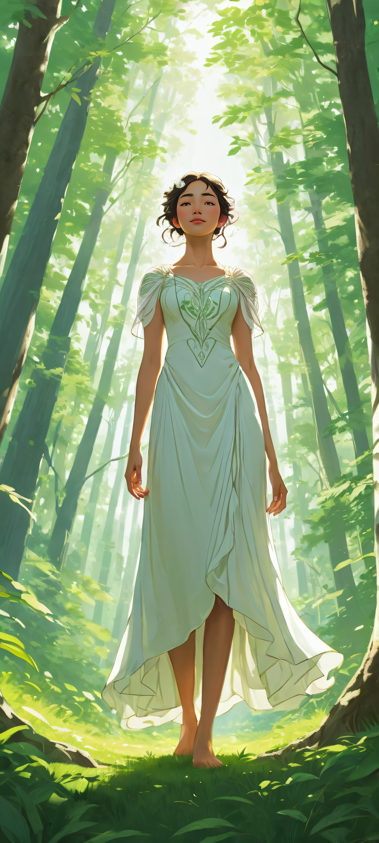 Original artwork of a ghibli-inspired character standing at the forest edge with intricate micro-details and ethereal lighting, perfectly optimized for iPhone/Android home screens.