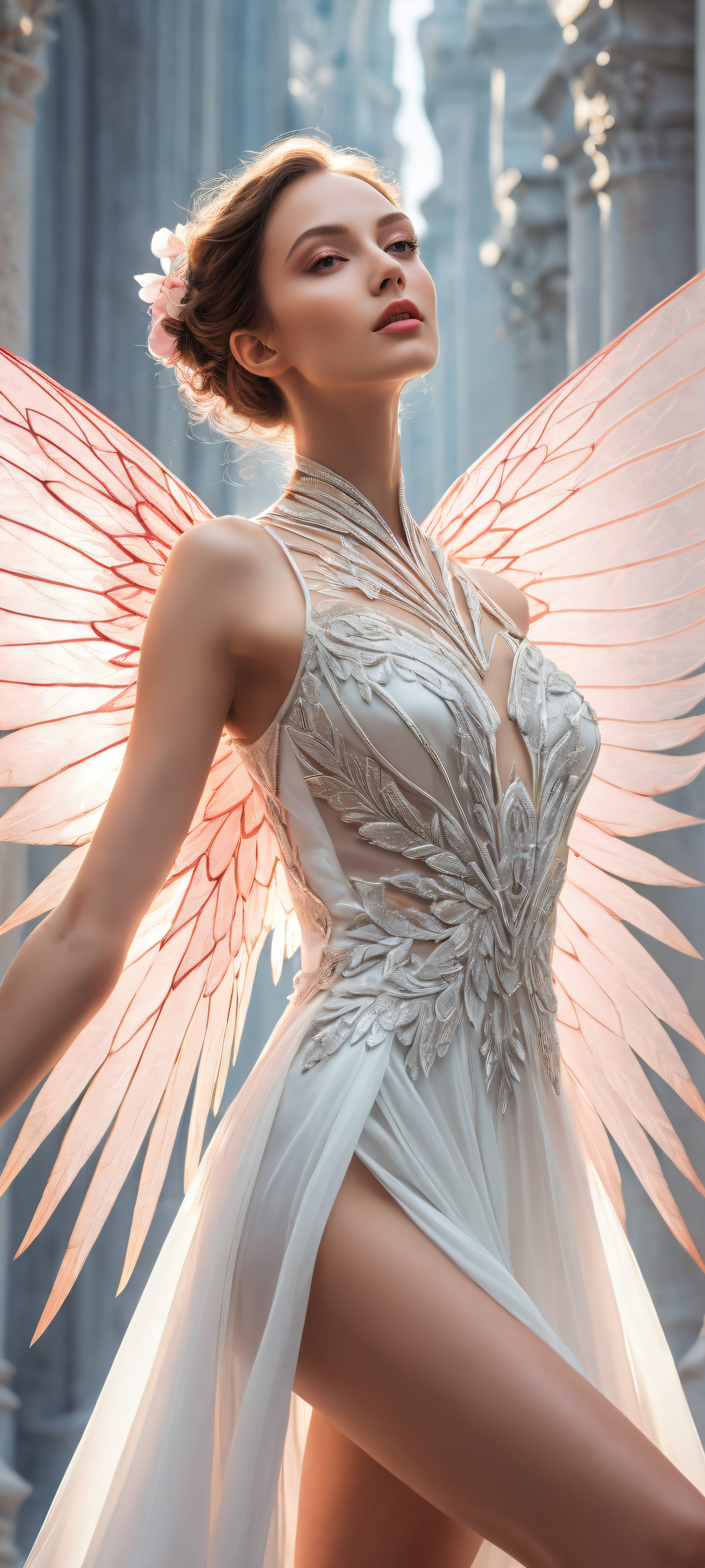 A breathtaking vertical portrait artwork of placed in the lower-middle with intricate micro-details, delicate wings spread wide in a dramatic dynamic pose, perfectly clean and empty top half with vast pure void, perfectly symmetrical vertical perspective, award-winning digital art, stunning visual impact, pristine clarity, ETHEREAL LIGHTING with radiant, brilliant colors, ray traced reflections, and pristine clarity, as if illuminated from within by an ethereal glow, Dominant color palette: Soft Pastel Hues of Pale Pink, Creamy White, and Whispered Grey, blending seamlessly to evoke a sense of serene elegance, ethereal lighting, radiant, brilliant colors, ray traced reflections, pristine clarity, portrait composition, centered subject in the lower middle, perfectly clean and smooth top half for UI, extreme depth of field blurred background, highly textured surfaces, intricate micro-details, physically based rendering, award-winning digital art, epic breathtaking scale, stunning visual impact, perfect composition, macOS wallpaper aesthetic, masterpiece, 2K QHD resolution, 9:20 aspect ratio.