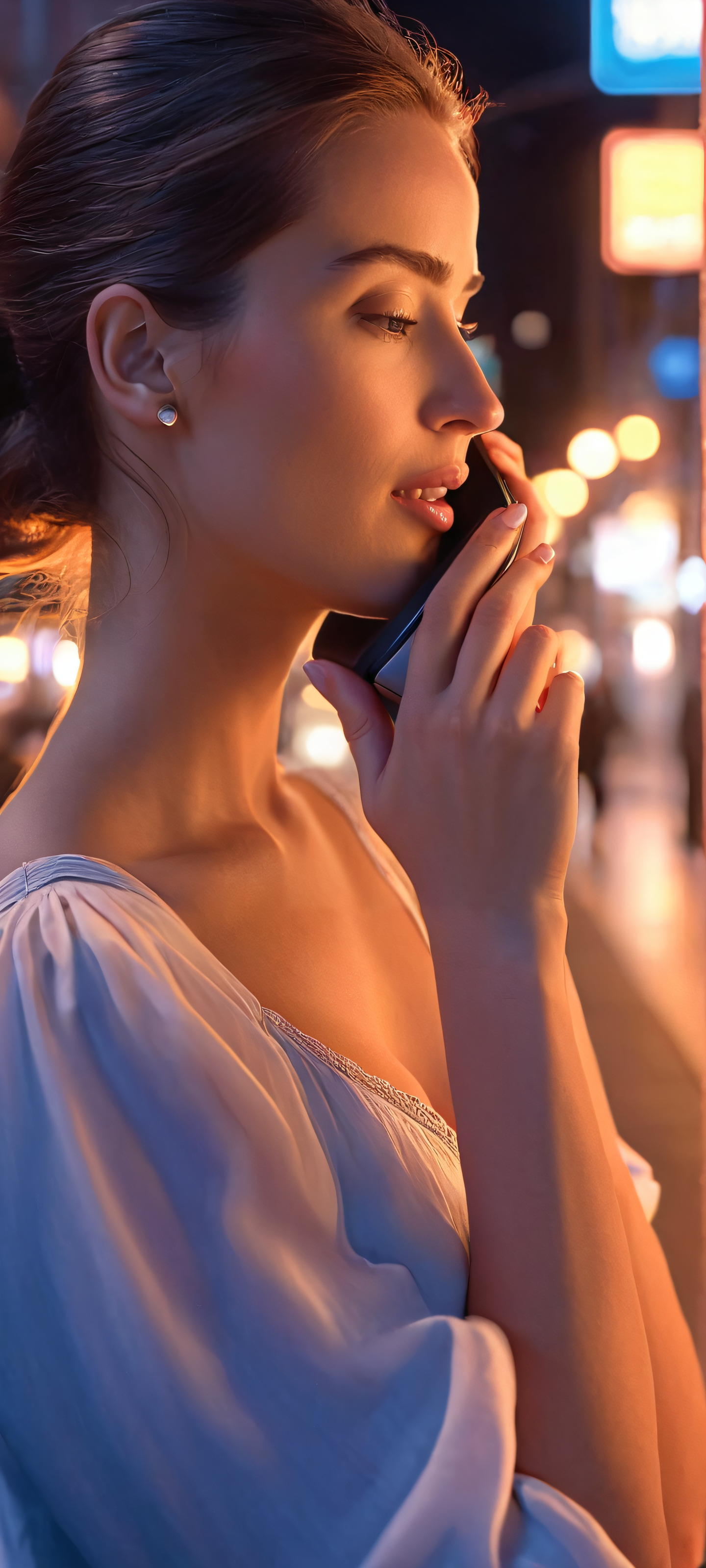 This stunning vertical wallpaper is perfectly optimized for your iPhone, Samsung Galaxy, and Android home screens. The breathtaking realism of the scene transports you to a bustling city street at night, where a woman shares a meaningful moment with someone over the phone.