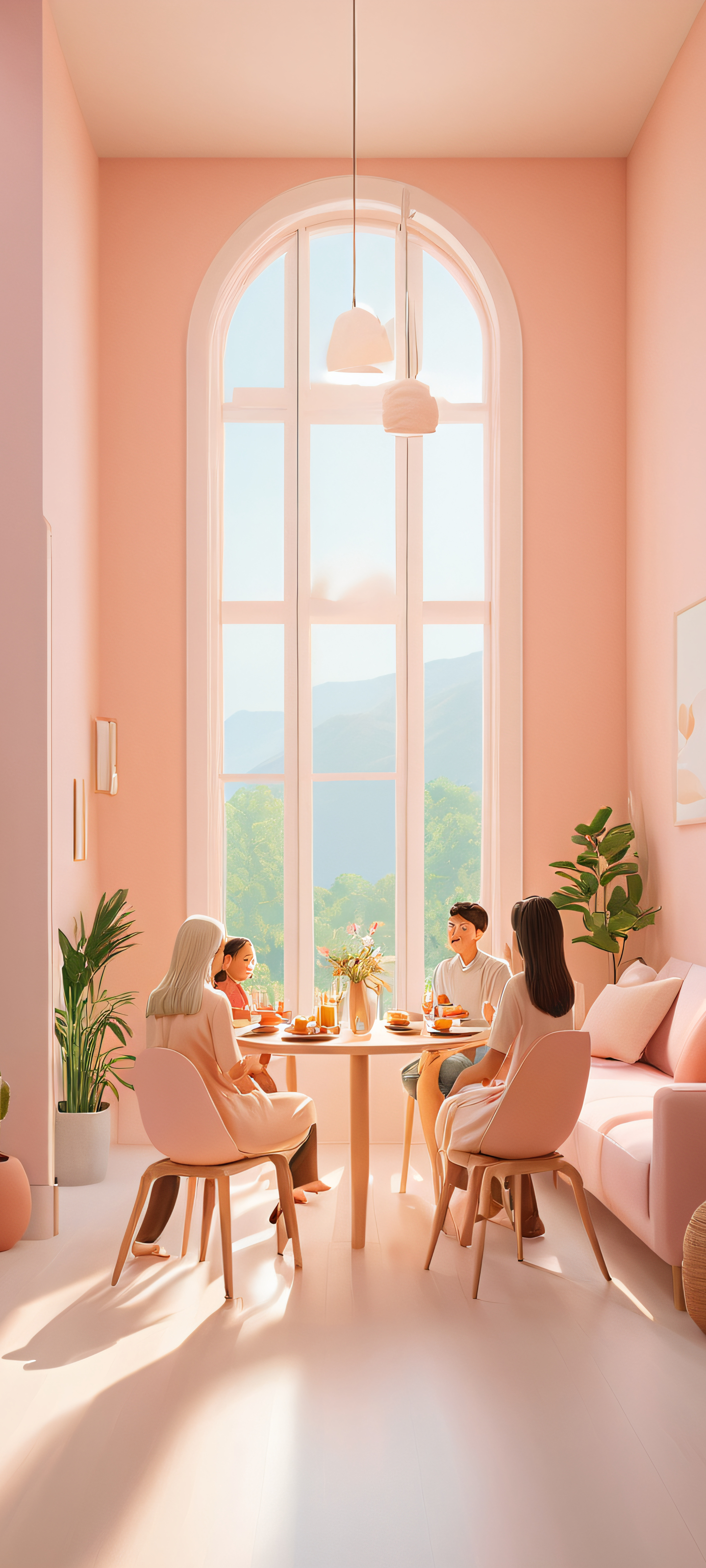 Elevate your mobile home screen with this stunning 2K QHD wallpaper, perfectly optimized for iPhone, Samsung Galaxy, and Android devices. This minimalist masterpiece captures the warmth of a family gathering, with soft, natural light and warm pastel hues that will transport you to a cozy haven.