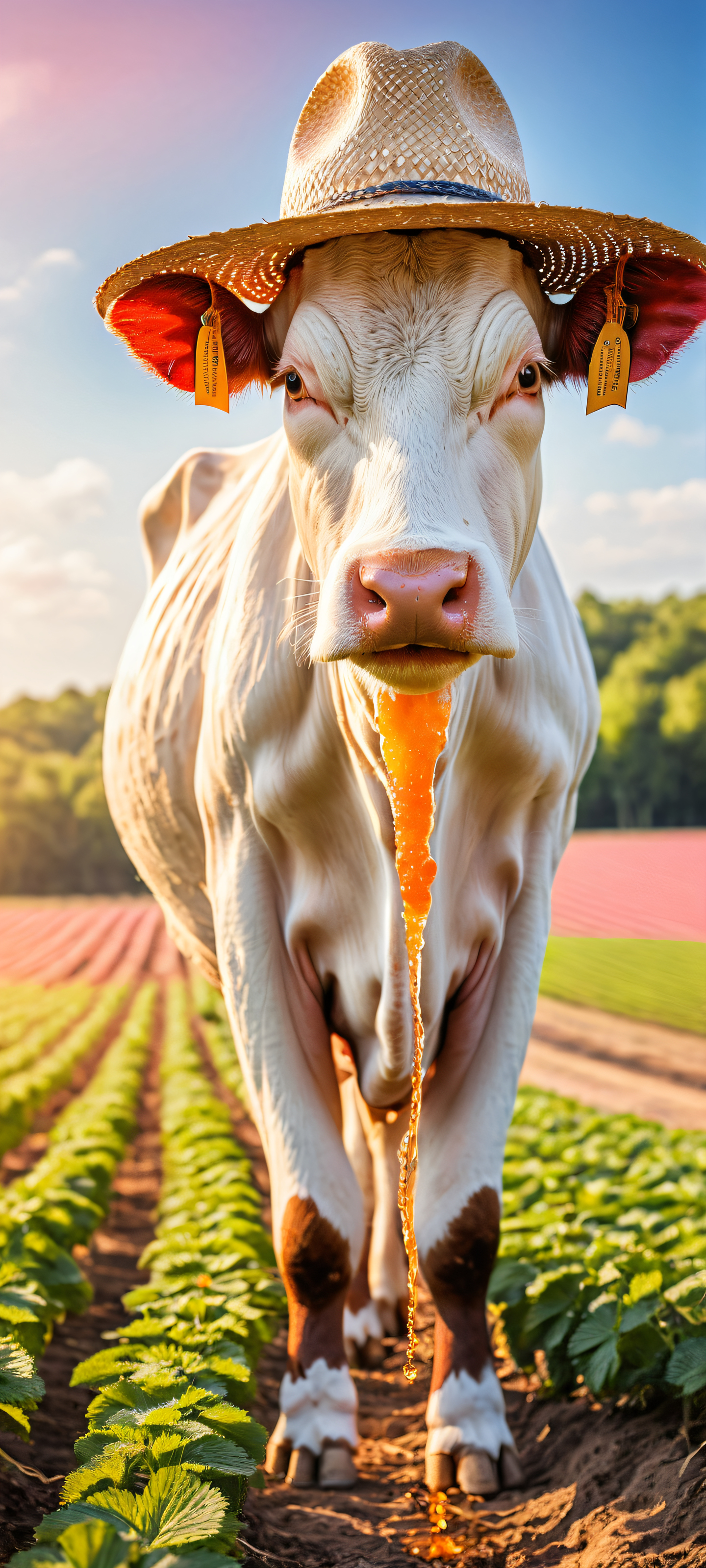 A breathtaking vertical portrait artwork of A cow-sized strawberry, orange, and blueberry with udders getting milked by a farmer in overalls and a straw hat, placed in the lower-middle, intricate micro-details, Perfectly clean and empty top half with vast pure void, allowing for crisp UI breathing space below, Award-winning digital art, stunning visual impact, pristine clarity, Ethereal, radiant light with soft, brilliant colors, ray-traced reflections, and flawless clarity, casting a warm glow on the scene, Pastel pink and creamy whites, with pops of bright blue and orange hues, evoking feelings of whimsy and playfulness, ethereal lighting, radiant, brilliant colors, ray traced reflections, pristine clarity, portrait composition, centered subject in the lower middle, perfectly clean and smooth top half for UI, extreme depth of field blurred background, highly textured surfaces, intricate micro-details, physically based rendering, award-winning digital art, epic breathtaking scale, stunning visual impact, perfect composition, macOS wallpaper aesthetic, masterpiece, 2K QHD resolution, 9:20 aspect ratio.