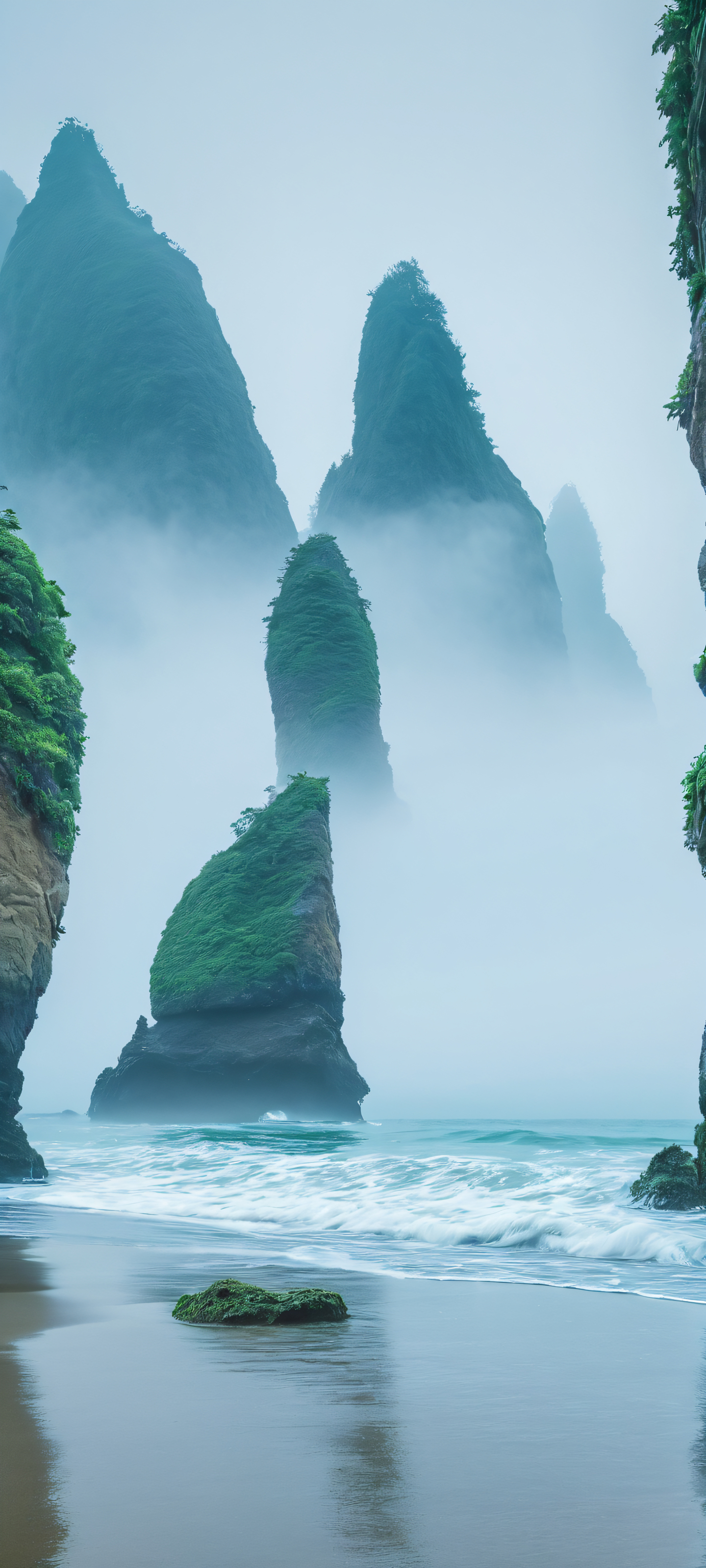 Escape to a surrealistic world of mystic beauty with this stunning vertical wallpaper. Perfectly optimized for your iPhone, Samsung Galaxy, or Android home screen, this masterpiece showcases the serenity of a foggy beach on a soft overcast day.