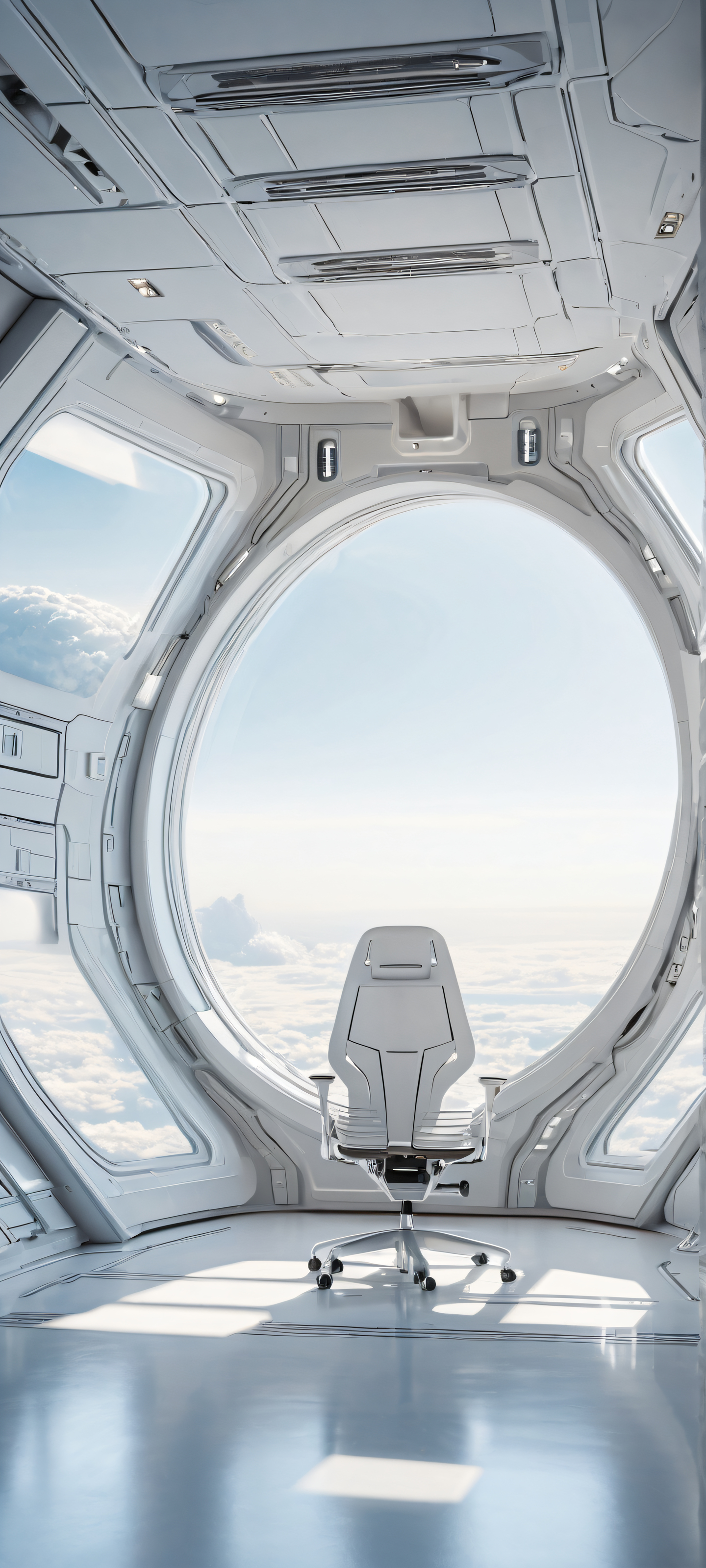 A breathtaking vertical portrait artwork of A spaceship’s intricate details placed in the lower-middle, showcasing insane micro-details and extreme depth of field., Perfectly clean and empty top half with vast pure void, while the bottom half features a futuristic interior with cables and chair, perfectly rendered in 8K resolution., Award-winning digital art, stunning visual impact, and pristine clarity., Ethereal daylight pouring through the spaceship’s windows, casting radiant beams and creating a sense of depth and dimensionality., A palette of soft blues, creamy whites, and subtle grays, evoking a sense of calmness and serenity., ethereal lighting, radiant, brilliant colors, ray traced reflections, pristine clarity, portrait composition, centered subject in the lower middle, perfectly clean and smooth top half for UI, extreme depth of field blurred background, highly textured surfaces, intricate micro-details, physically based rendering, award-winning digital art, epic breathtaking scale, stunning visual impact, perfect composition, macOS wallpaper aesthetic, masterpiece, 2K QHD resolution, 9:20 aspect ratio.