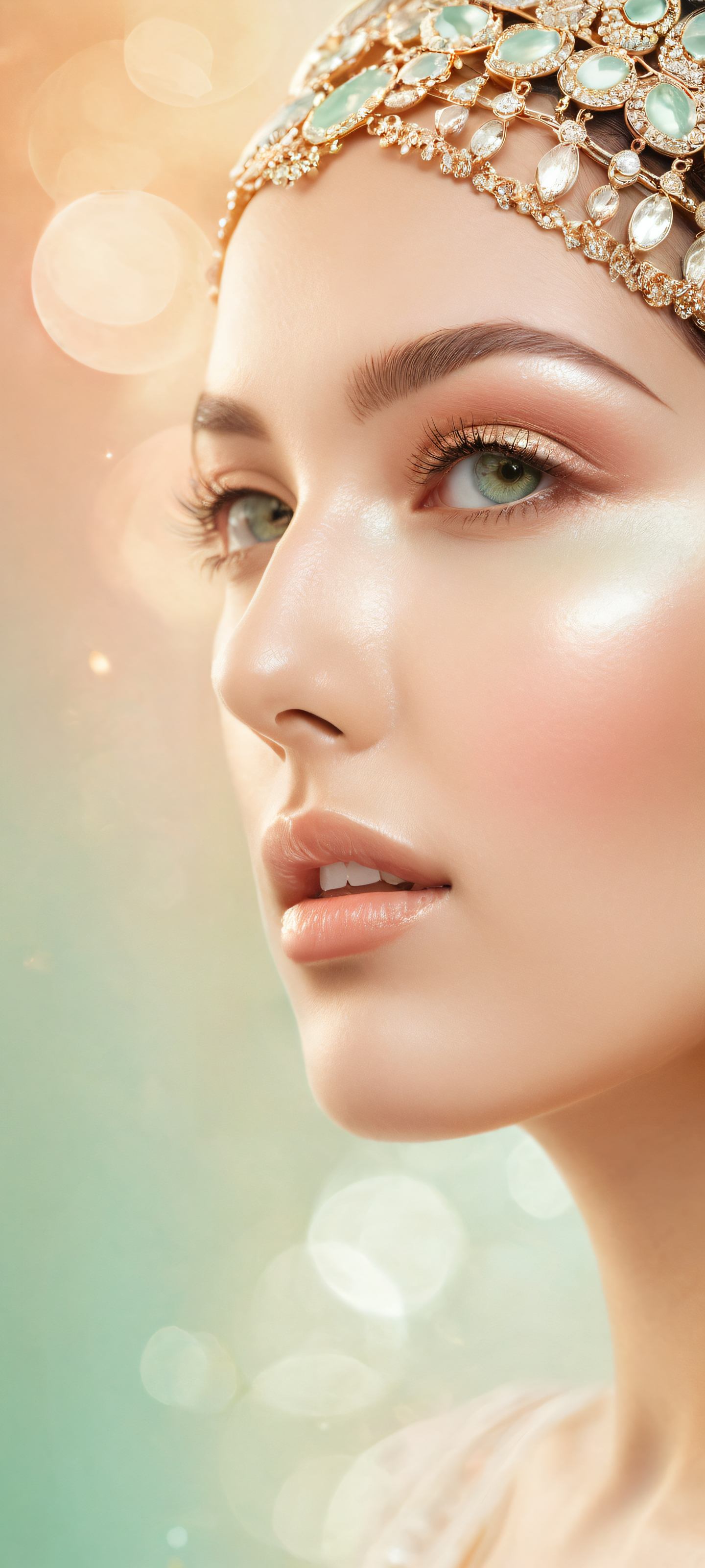 A breathtaking vertical portrait artwork of beautiful faces placed in the lower-middle, intricate micro-details of smooth skin and precise facial features, perfectly clean and empty top half with vast pure void, juxtaposed against a background of vibrant colors and delicate patterns, award-winning digital art, stunning visual impact with crisp, high-resolution details and pristine clarity, Ethereal lighting with soft, radiant rays that illuminate the subject from multiple angles, creating an airy and dreamy atmosphere, #F7D2C4 (Warm Beige), #87CEEB (Soft Mint Green), and #FFC6B3 (Pinkish Beige), ethereal lighting, radiant, brilliant colors, ray traced reflections, pristine clarity, portrait composition, centered subject in the lower middle, perfectly clean and smooth top half for UI, extreme depth of field blurred background, highly textured surfaces, intricate micro-details, physically based rendering, award-winning digital art, epic breathtaking scale, stunning visual impact, perfect composition, macOS wallpaper aesthetic, masterpiece, 2K QHD resolution, 9:20 aspect ratio.