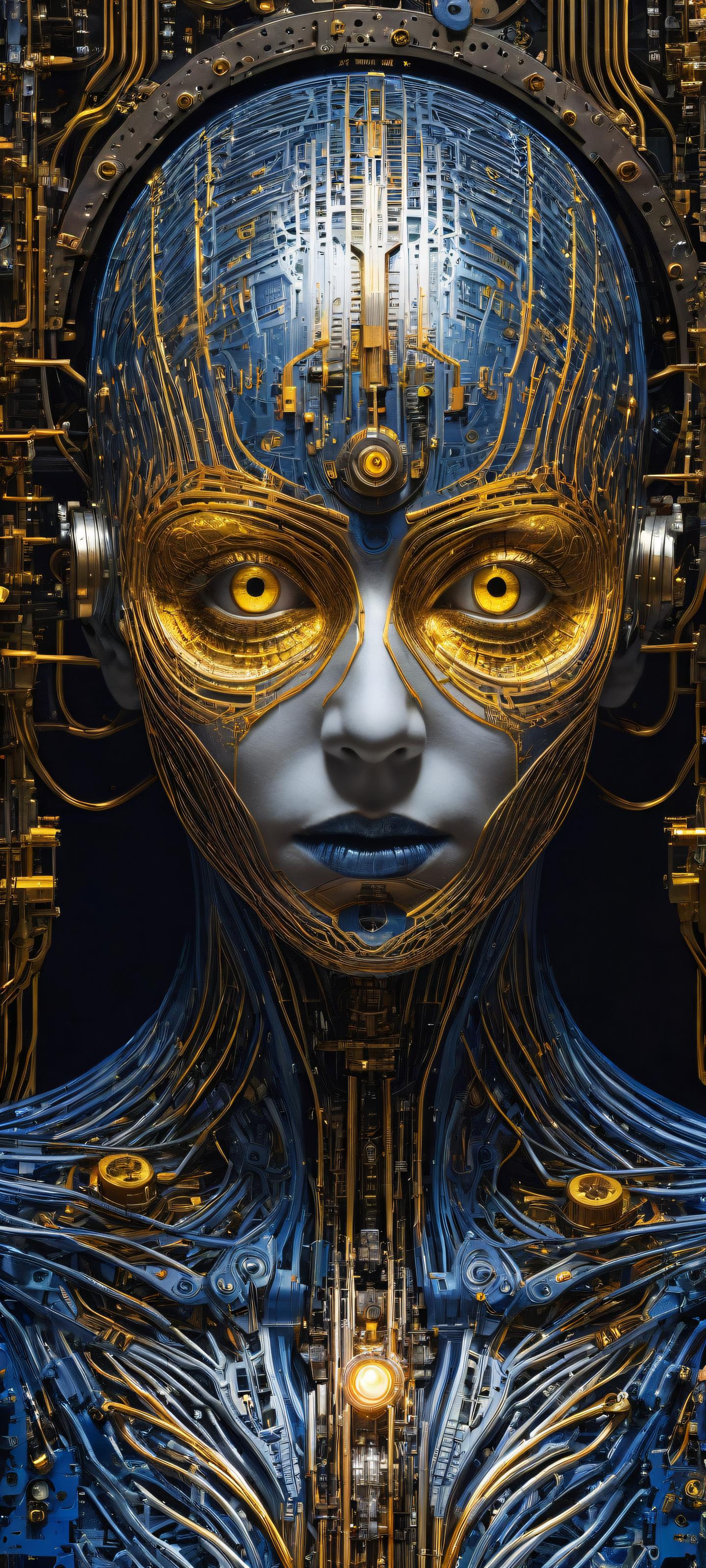 A breathtaking vertical portrait artwork of A mysterious figure placed in the lower-middle, intricate micro-details of mechanical components and circuit boards, with a striking yellow eye that stands out amidst the darkness., Perfectly clean and empty top half with vast pure void, contrasted by the dark, industrial background on the right side, featuring mechanical elements and cinematic octane-style details., Award-winning digital art with stunning visual impact, featuring perfectly rendered metallic textures and reflections, and pristine clarity., Ethereal lighting with radiant, brilliant colors, ray-traced reflections, and flawless highlights that showcase the intricate details of the subject., Dominant shades of indigo blue, metallic grays, and bright yellow, evoking a sense of mystery and high-tech innovation., ethereal lighting, radiant, brilliant colors, ray traced reflections, pristine clarity, portrait composition, centered subject in the lower middle, perfectly clean and smooth top half for UI, extreme depth of field blurred background, highly textured surfaces, intricate micro-details, physically based rendering, award-winning digital art, epic breathtaking scale, stunning visual impact, perfect composition, macOS wallpaper aesthetic, masterpiece, 2K QHD resolution, 9:20 aspect ratio.