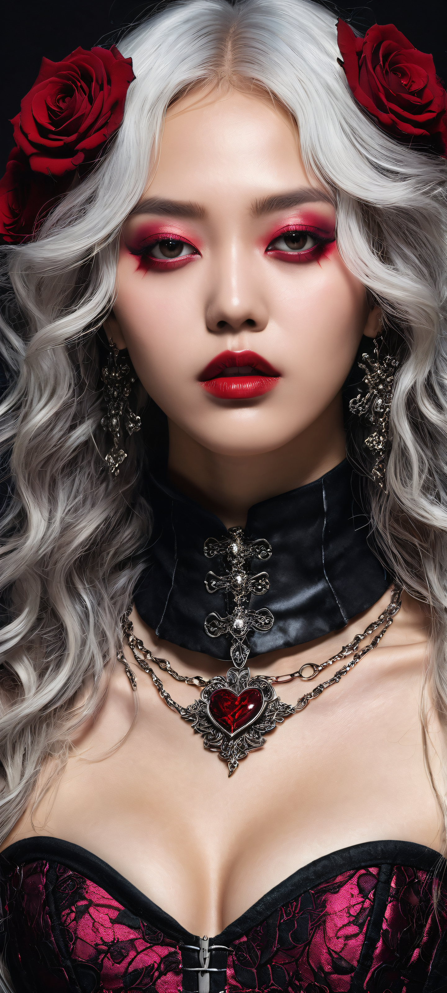 A breathtaking vertical portrait artwork of A mad K-pop idol placed in the lower-middle with intricate micro-details: curly silver long hair, black corset bindings, and a collar of dark roses and rotten rats around her neck, with a red-black rose heart., A perfectly clean and empty top half with vast pure void, allowing for seamless interaction with UI widgets. The bottom half features the eerie portrait in a state of decay, with a dark, mysterious atmosphere., Award-winning digital art with stunning visual impact, featuring flawless lines, textures, and reflections. Pristine clarity and a sense of depth., Ethereal lighting with radiant, brilliant colors and ray-traced reflections. Soft, diffused light falls upon the subject, illuminating her face and clothes with an otherworldly glow., #660000 (Deep Magenta) with undertones of black and red, evoking a sense of dark mystery and foreboding., ethereal lighting, radiant, brilliant colors, ray traced reflections, pristine clarity, portrait composition, centered subject in the lower middle, perfectly clean and smooth top half for UI, extreme depth of field blurred background, highly textured surfaces, intricate micro-details, physically based rendering, award-winning digital art, epic breathtaking scale, stunning visual impact, perfect composition, macOS wallpaper aesthetic, masterpiece, 2K QHD resolution, 9:20 aspect ratio.