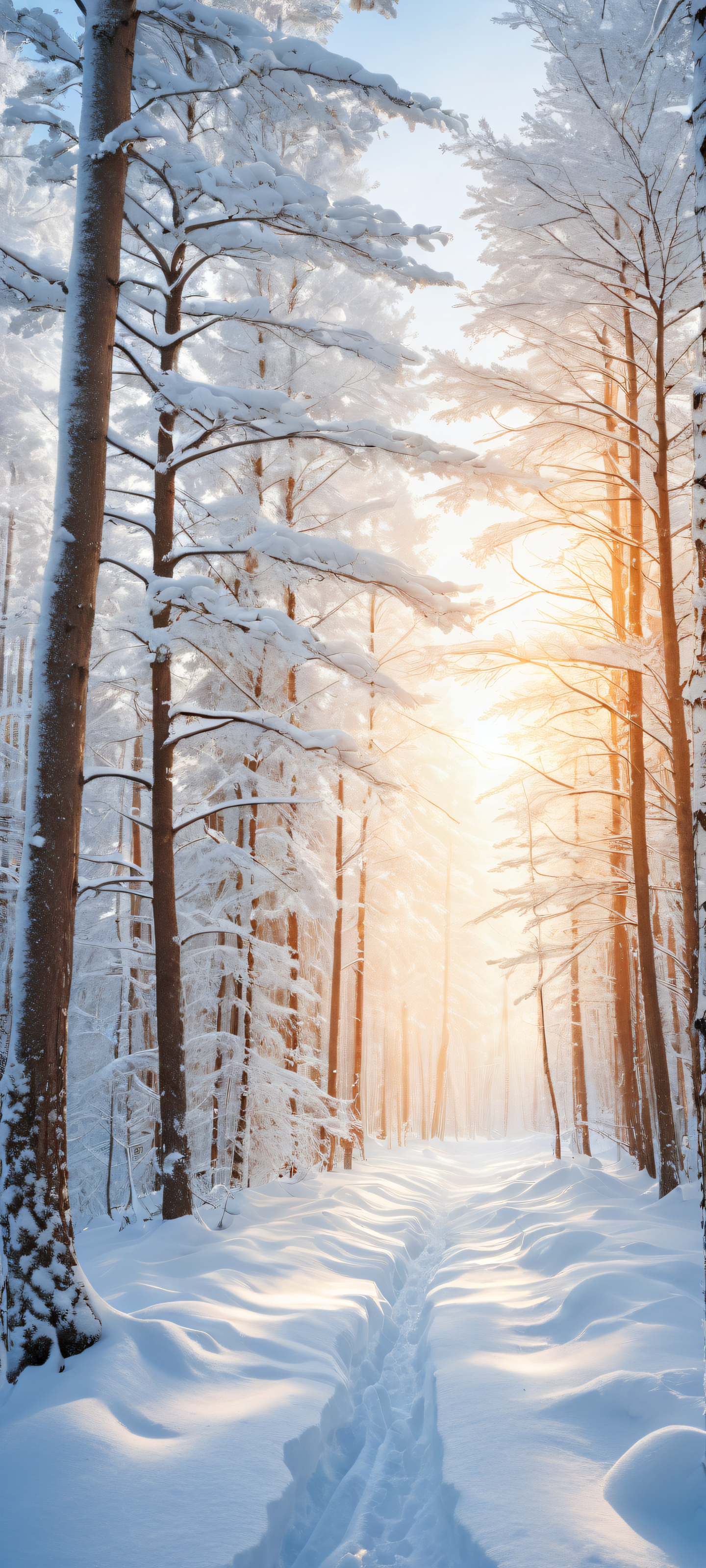 A breathtaking vertical portrait artwork of Snow-capped Trees placed in the lower-middle with intricate micro-details, Perfectly clean and empty top half with vast pure void, allowing for seamless integration of UI elements below, Award-winning digital art, pristine clarity, featuring stunning visual impact and flawless execution, Ethereal lighting with radiant, brilliant colors, ray-traced reflections, and pristine clarity, casting a warm glow on the snow-capped trees, Dominant color palette featuring shades of soft blue (#87CEEB), creamy white (#F5F5DC), and subtle wisps of golden yellow (#F7D2C4), ethereal lighting, radiant, brilliant colors, ray traced reflections, pristine clarity, portrait composition, centered subject in the lower middle, perfectly clean and smooth top half for UI, extreme depth of field blurred background, highly textured surfaces, intricate micro-details, physically based rendering, award-winning digital art, epic breathtaking scale, stunning visual impact, perfect composition, macOS wallpaper aesthetic, masterpiece, 2K QHD resolution, 9:20 aspect ratio.