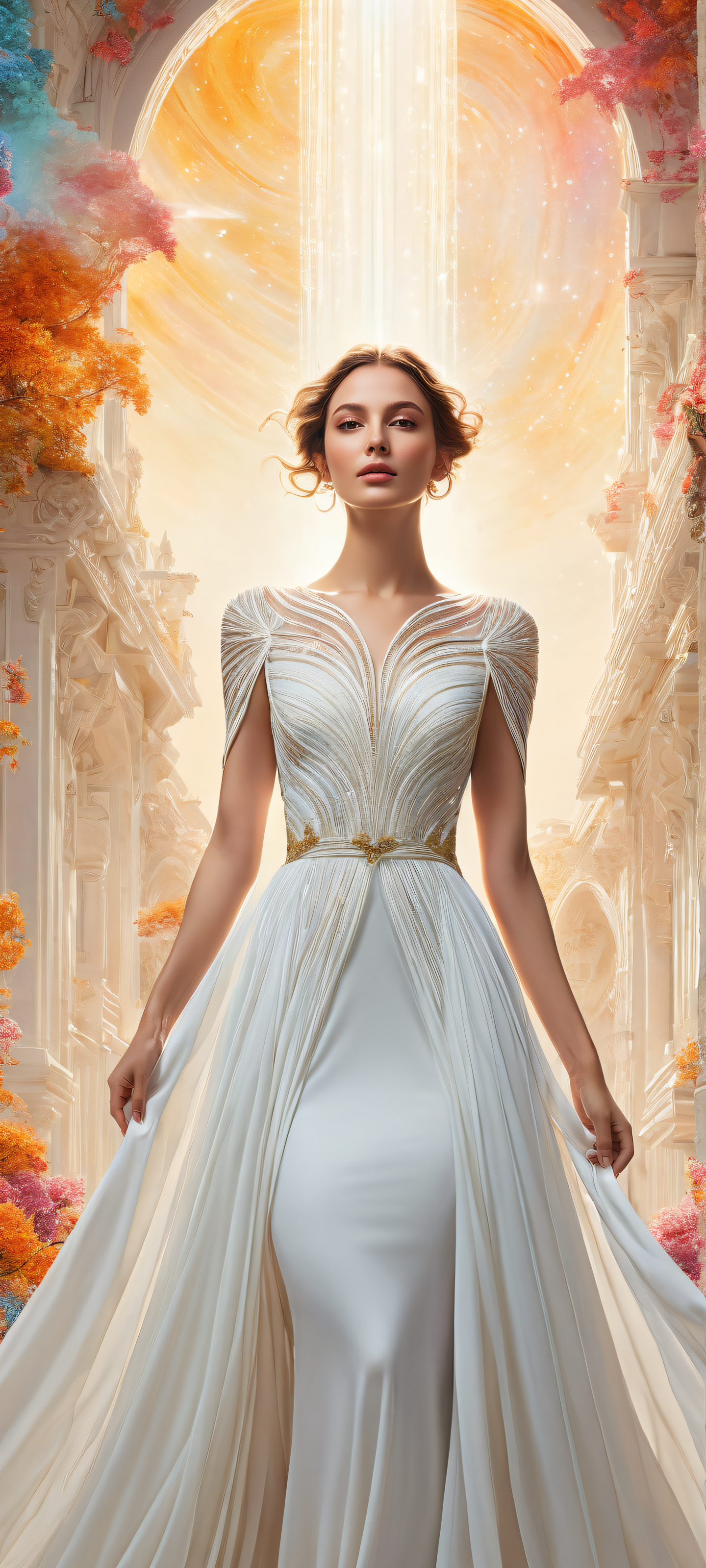 Parfaitement optimisé pour votre iPhone, SamsungGalaxy, et écrans d'accueil Android. This breathtaking digital artwork features an ethereal goddess in an all-white dress, juxtaposed against a luxurious background with glass-like surfaces and smooth textures. With insane micro-details and pristine clarity, this 2K QHD mobile wallpaper is sure to leave you mesmerized.