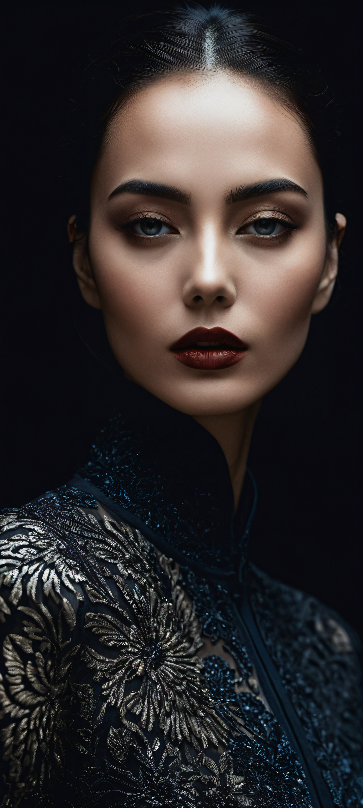 A breathtaking vertical portrait artwork of A woman’s portrait placed in the lower-middle with intricate micro-details, Perfectly clean and empty top half with vast pure void, contrasted by a deep, atmospheric background, Award-winning digital art, pristine clarity, and stunning visual impact, Sleek Dark Mode aesthetic with deep perfect blacks and striking crisp contrast, [‘Deep blues’, ‘Muted silvers’, ‘Dark grays’], elegant low-key lighting, deep perfect blacks, striking contrast, sleek dark mode aesthetic, luminescent accents, deep rich colors, portrait composition, centered subject in the lower middle, perfectly clean and smooth top half for UI, extreme depth of field blurred background, highly textured surfaces, intricate micro-details, physically based rendering, award-winning digital art, epic breathtaking scale, stunning visual impact, perfect composition, macOS wallpaper aesthetic, masterpiece, 2K QHD resolution, 9:20 aspect ratio.
