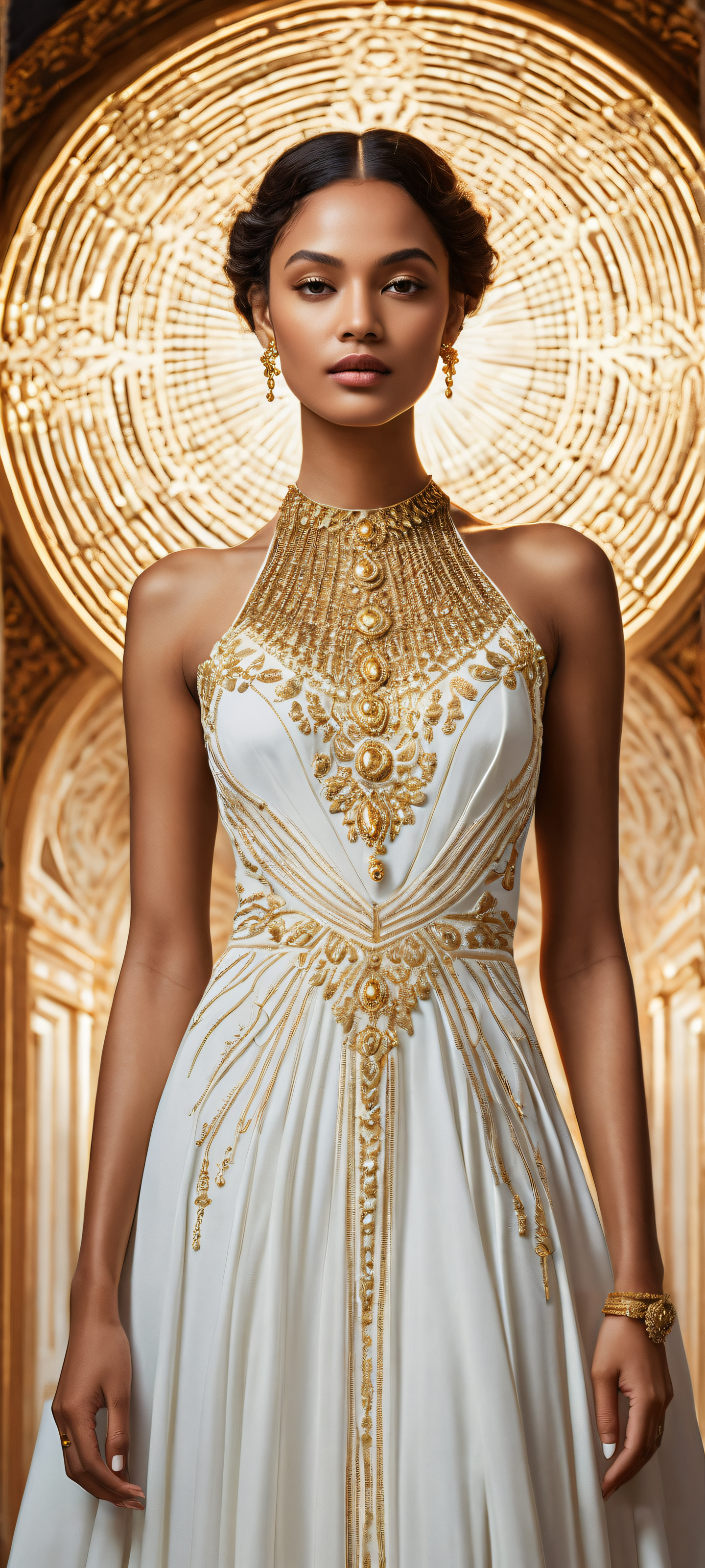 A breathtaking vertical portrait artwork of A prestigious beautiful woman dressed in an all white dress, placed in the lower-middle with intricate micro-details, Perfectly clean and empty top half with vast pure void, seamlessly blending into the background of the woman’s dress, Award-winning digital art, pristine clarity, featuring a cinematic photograph with luxurious gold trim and planetary sphere head emitting natural weather phenomenon and neon ethereal ozonous layers, Sleek Dark Mode Aesthetic with deep perfect blacks, striking crisp contrast, and elegant luminescent accents, Dominant colors include rich golds, creamy whites, and a hint of deep blues and purples, evoking a sense of luxury and mystery, elegant low-key lighting, deep perfect blacks, striking contrast, sleek dark mode aesthetic, luminescent accents, deep rich colors, portrait composition, centered subject in the lower middle, perfectly clean and smooth top half for UI, extreme depth of field blurred background, highly textured surfaces, intricate micro-details, physically based rendering, award-winning digital art, epic breathtaking scale, stunning visual impact, perfect composition, macOS wallpaper aesthetic, masterpiece, 2K QHD resolution, 9:20 aspect ratio.
