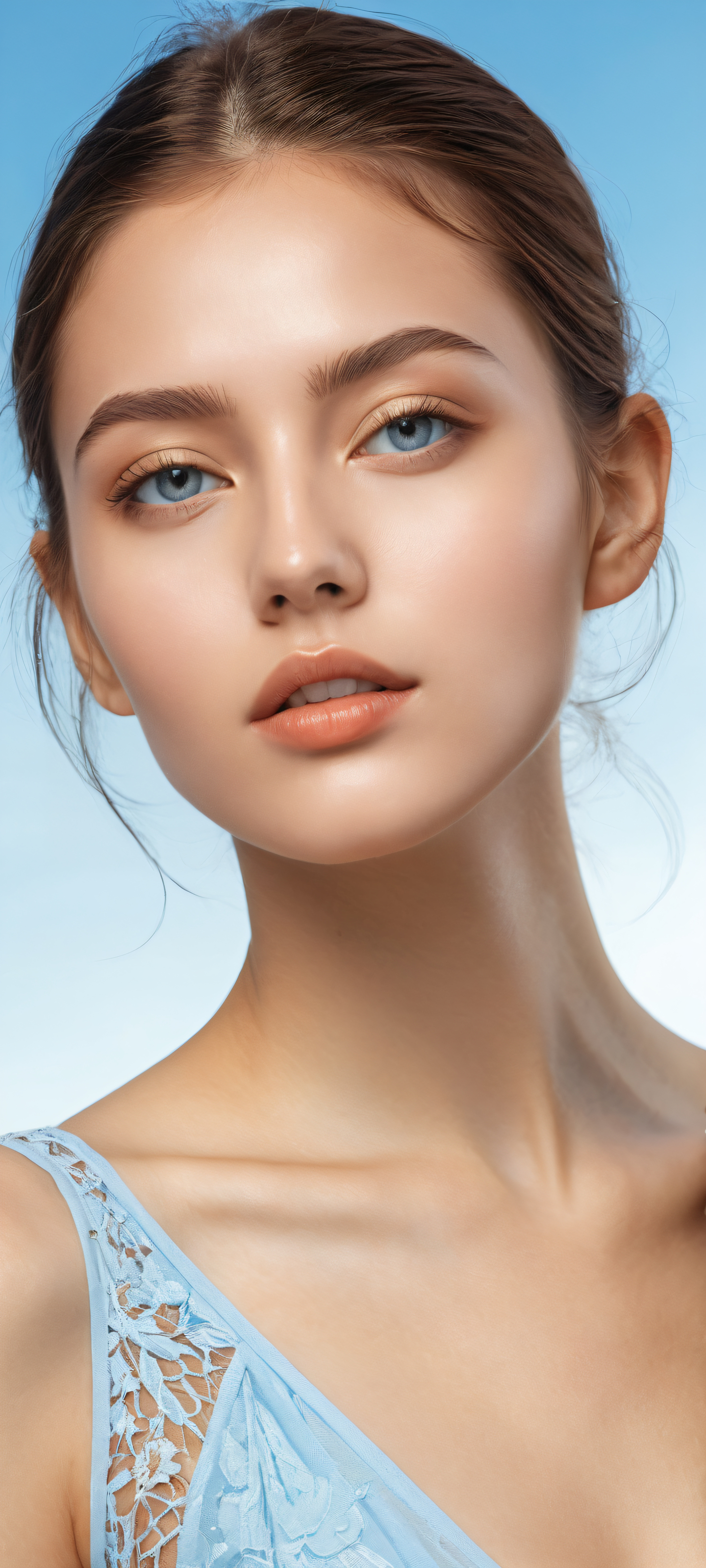 A breathtaking vertical portrait artwork of A young woman placed in the lower-middle with intricate micro-details on her face and clothing, yet maintaining a relaxed and effortless pose., A perfectly clean and empty top half with vast pure void, allowing for an unobstructed view of the subject, and creating a sense of depth and infinity., Award-winning digital art, stunning visual impact, and pristine clarity, reminiscent of high-end cinematic productions., Ethereal lighting with volumetric effects, capturing the essence of cinematic cinematography, with soft, radiant colors and ray-traced reflections that dance across the scene., #87CEEB (Pale Blue), #F5F5DC (Cream), #8B4513 (Earth Brown), ethereal lighting, radiant, brilliant colors, ray traced reflections, pristine clarity, portrait composition, centered subject in the lower middle, perfectly clean and smooth top half for UI, extreme depth of field blurred background, highly textured surfaces, intricate micro-details, physically based rendering, award-winning digital art, epic breathtaking scale, stunning visual impact, perfect composition, macOS wallpaper aesthetic, masterpiece, 2K QHD resolution, 9:20 aspect ratio.