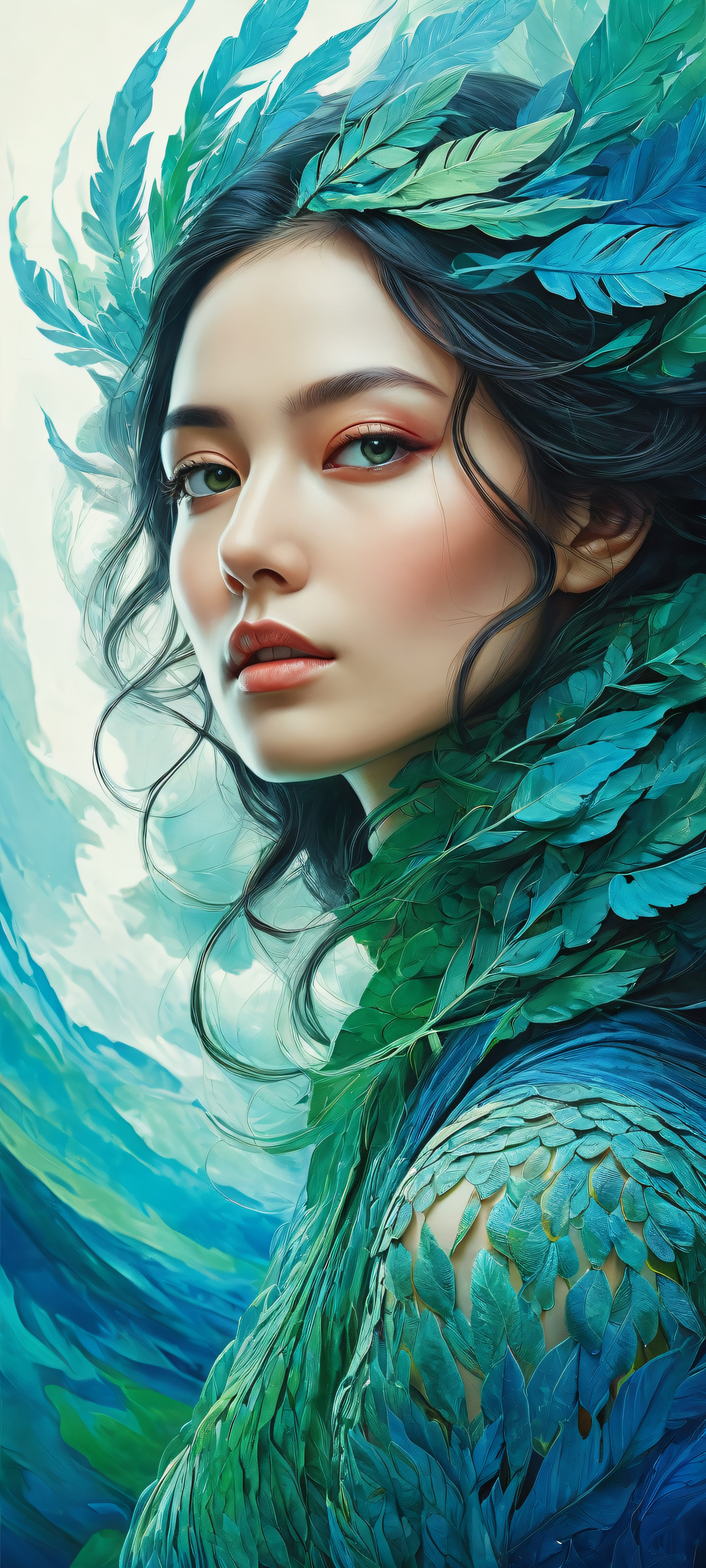 A breathtaking vertical portrait artwork of Vibrantly colored abstract shapes placed in the lower-middle with insane intricate micro-details, Perfectly clean and empty top half with vast pure void, contrasted by intricately rendered, high-contrast background textures below, Award-winning digital art with painterly brushstrokes and pristine clarity, Éthéré, cinematic lighting with soft focus highlights and deep shadows, emphasizing the subject’s three-dimensional form, [‘Vibrant blues and greens’, ‘Intricate ink wash hues’], ethereal lighting, radiant, brilliant colors, ray traced reflections, pristine clarity, portrait composition, centered subject in the lower middle, perfectly clean and smooth top half for UI, extreme depth of field blurred background, highly textured surfaces, intricate micro-details, physically based rendering, award-winning digital art, epic breathtaking scale, stunning visual impact, perfect composition, macOS wallpaper aesthetic, masterpiece, 2K QHD resolution, 9:20 aspect ratio.