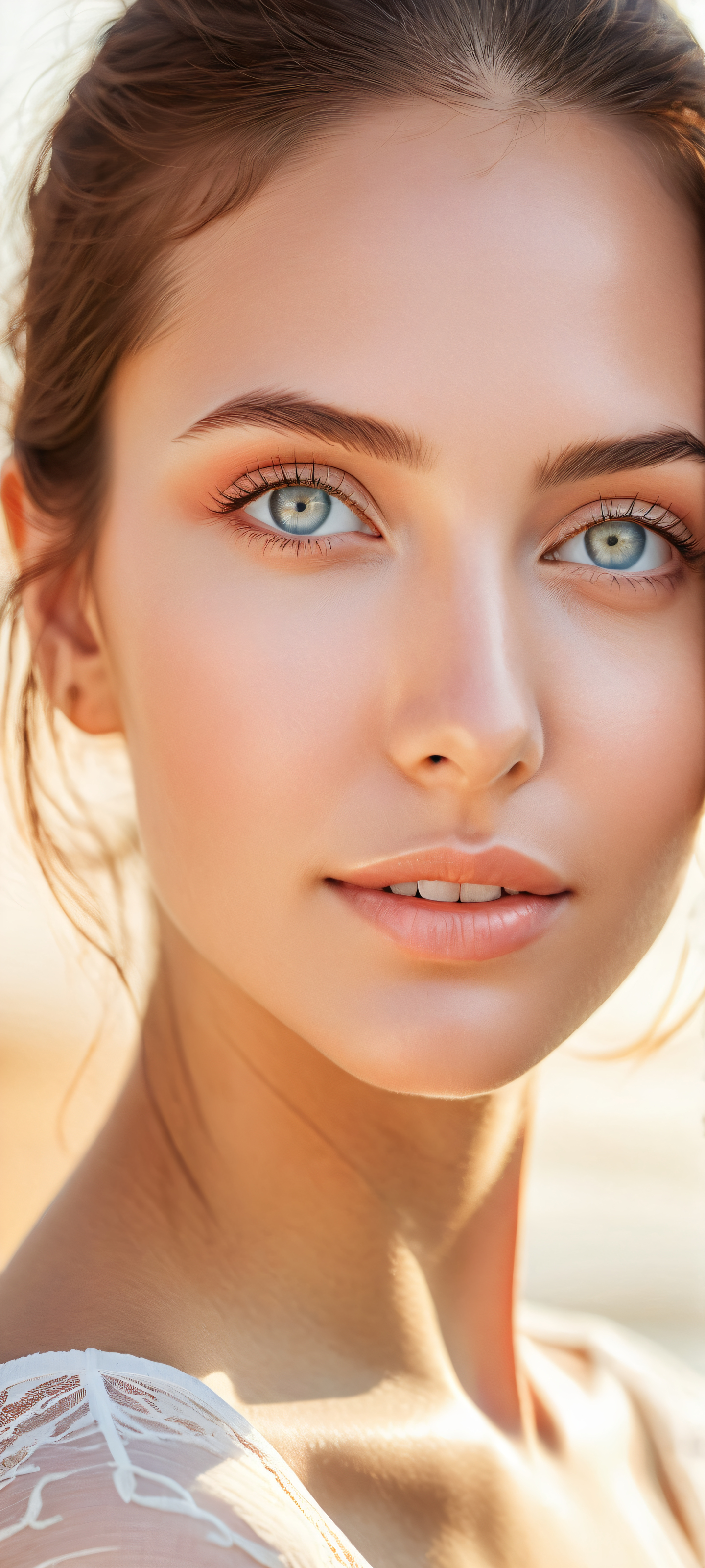 A breathtaking vertical portrait artwork of A woman with beautiful eyes placed in the lower-middle, intricate micro-details of her facial structure and subtle smiles., Perfectly clean and empty top half with vast pure void, allowing for a seamless transition to the serene background featuring gentle waves or ripples, Award-winning digital art, pristine clarity with an emphasis on smooth curves and soft textures, Ethereal lighting with brilliant colors and ray-traced reflections that radiate warmth and serenity, mimicking the soft glow of morning sunlight, Pastel shades with hues of peach, ivory, and creamy whites, evoking a sense of innocence and purity, ethereal lighting, radiant, brilliant colors, ray traced reflections, pristine clarity, portrait composition, centered subject in the lower middle, perfectly clean and smooth top half for UI, extreme depth of field blurred background, highly textured surfaces, intricate micro-details, physically based rendering, award-winning digital art, epic breathtaking scale, stunning visual impact, perfect composition, macOS wallpaper aesthetic, masterpiece, 2K QHD resolution, 9:20 aspect ratio.