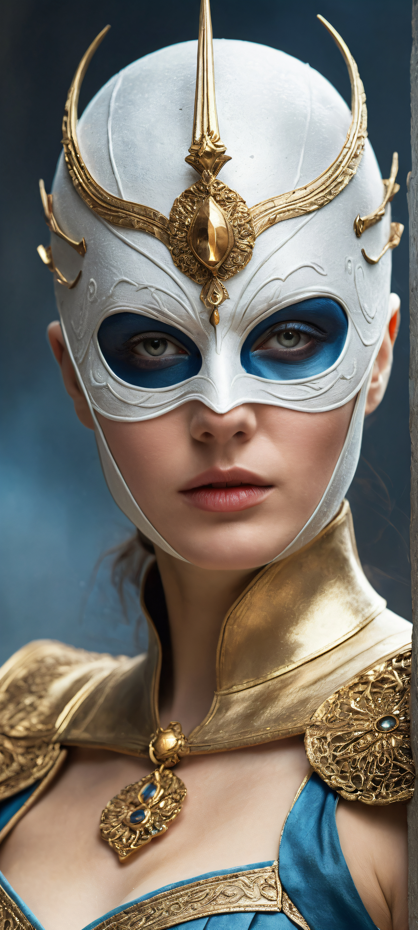 A breathtaking vertical portrait artwork of A 1800s masked hero with a sad face, placed in the lower-middle with insane micro-details such as small natural breasts and sagging breasts, hand on her rapier in the scabbard., The background features a perfectly clean and empty top half with vast pure void, allowing for an unobstructed view of the hero, while the bottom half slowly transitions into a subtle rain effect, Award-winning digital art, stunning visual impact with crisp lines, vibrant colors, and flawless texture. This is a true masterpiece that showcases the highest level of artistic excellence., Ethereal lighting with soft, radiant colors that seem to come from above, creating a sense of warmth and comfort. The lighting is gentle yet powerful, highlighting the hero’s features without overpowering them., The dominant color palette consists of muted blues and grays, with hints of golden light reflecting off the rain-soaked surfaces, evoking feelings of melancholy and introspection., ethereal lighting, radiant, brilliant colors, ray traced reflections, pristine clarity, portrait composition, centered subject in the lower middle, perfectly clean and smooth top half for UI, extreme depth of field blurred background, highly textured surfaces, intricate micro-details, physically based rendering, award-winning digital art, epic breathtaking scale, stunning visual impact, perfect composition, macOS wallpaper aesthetic, masterpiece, 2K QHD resolution, 9:20 aspect ratio.