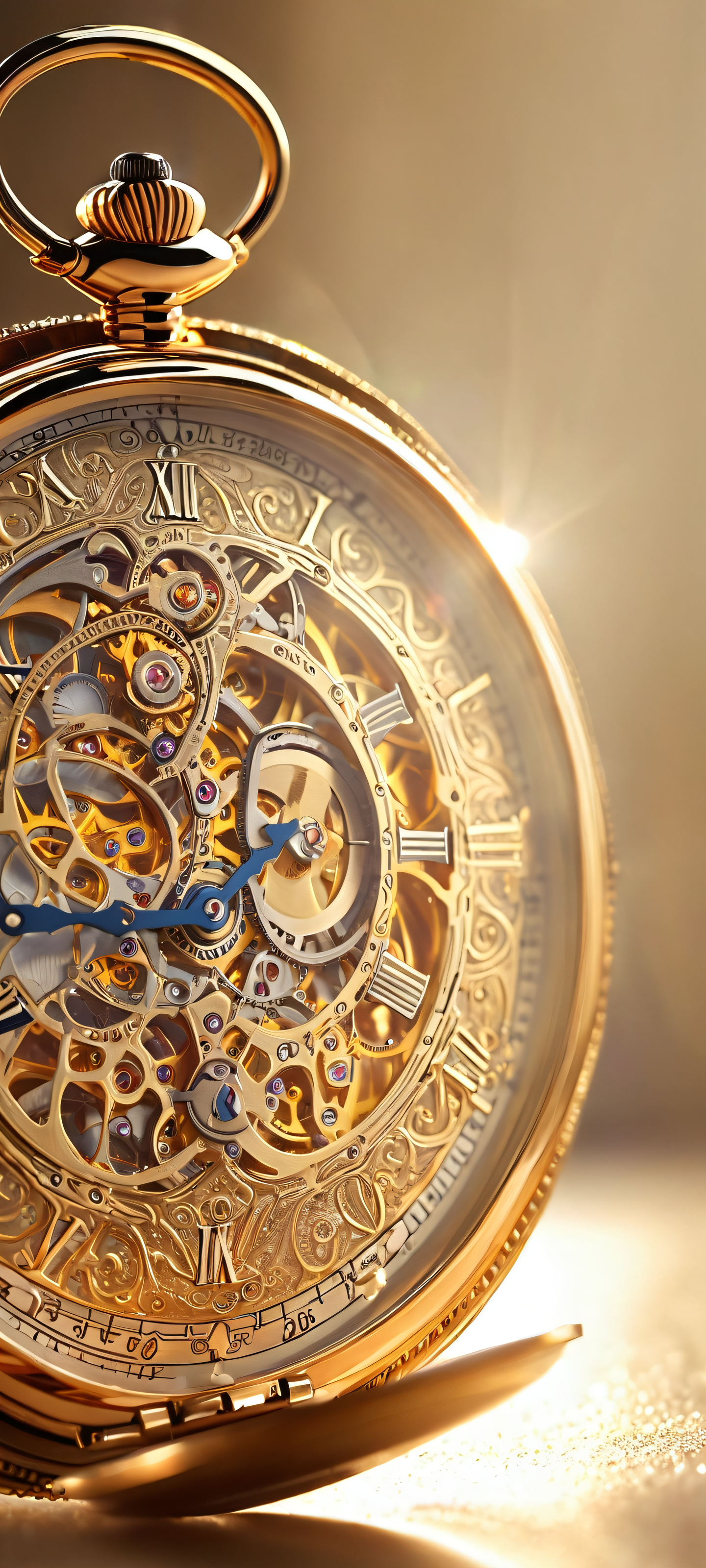 A breathtaking vertical portrait artwork of A luxurious, intricately designed pocket watch placed in the lower-middle with insane micro-details., Perfectly clean and empty top half with vast pure void, allowing for seamless UI integration., Award-winning digital art, stunning visual impact, and pristine clarity., Ethereal lighting that radiates brilliant colors, ray-traced reflections, and crisp clarity, giving the illusion of being illuminated by an invisible light source., [‘Warm golds’, ‘Soft silvers’], ethereal lighting, radiant, brilliant colors, ray traced reflections, pristine clarity, portrait composition, centered subject in the lower middle, perfectly clean and smooth top half for UI, extreme depth of field blurred background, highly textured surfaces, intricate micro-details, physically based rendering, award-winning digital art, epic breathtaking scale, stunning visual impact, perfect composition, macOS wallpaper aesthetic, masterpiece, 2K QHD resolution, 9:20 aspect ratio.